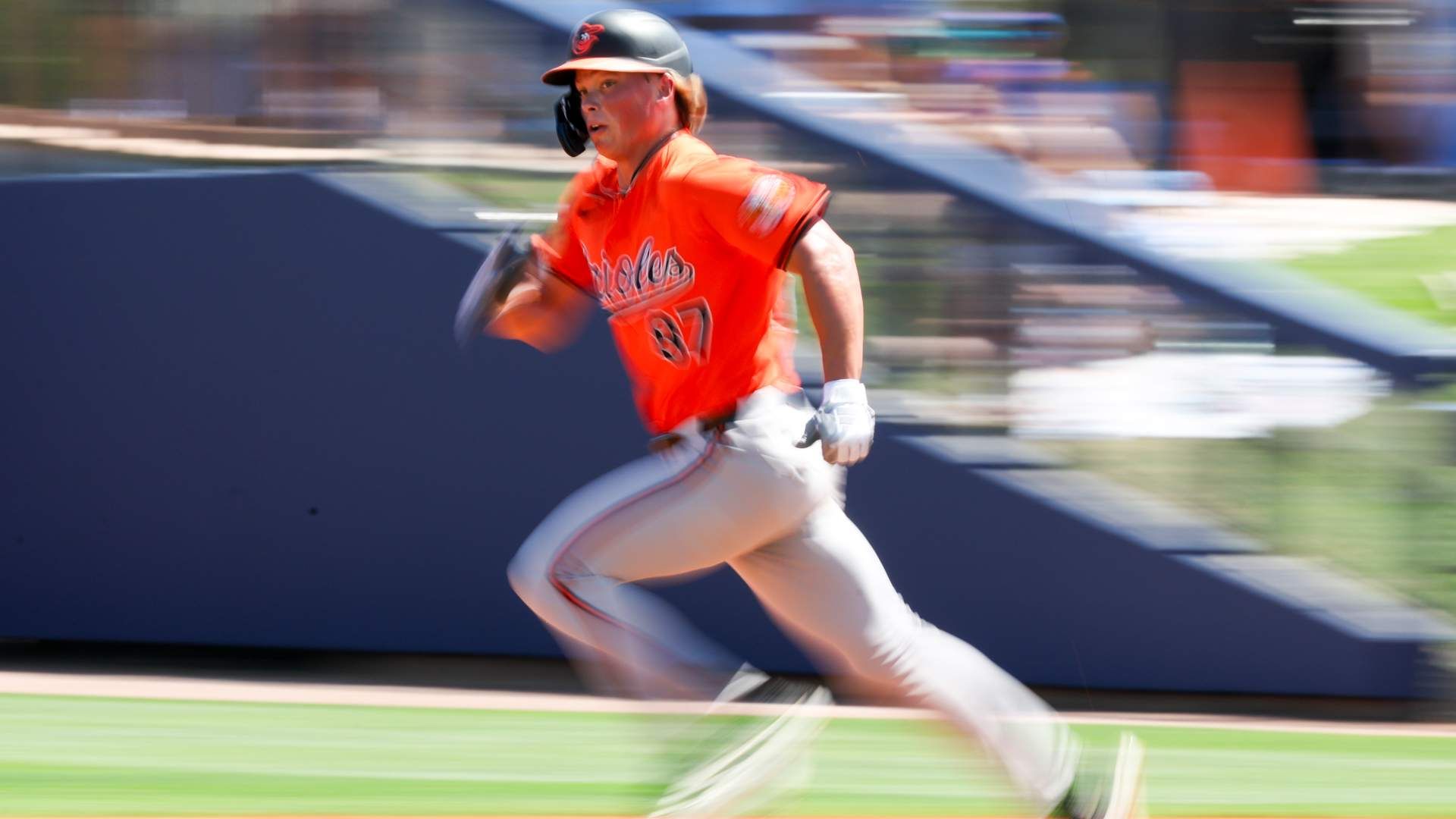 Mar 15, 2024; Port Charlotte, Florida, USA; Baltimore Orioles shortstop Jackson Holliday (87) runs the bases against the Tampa Bay Rays in the second inning at Charlotte Sports Park. Mandatory Credit: Nathan Ray Seebeck-USA TODAY Sports