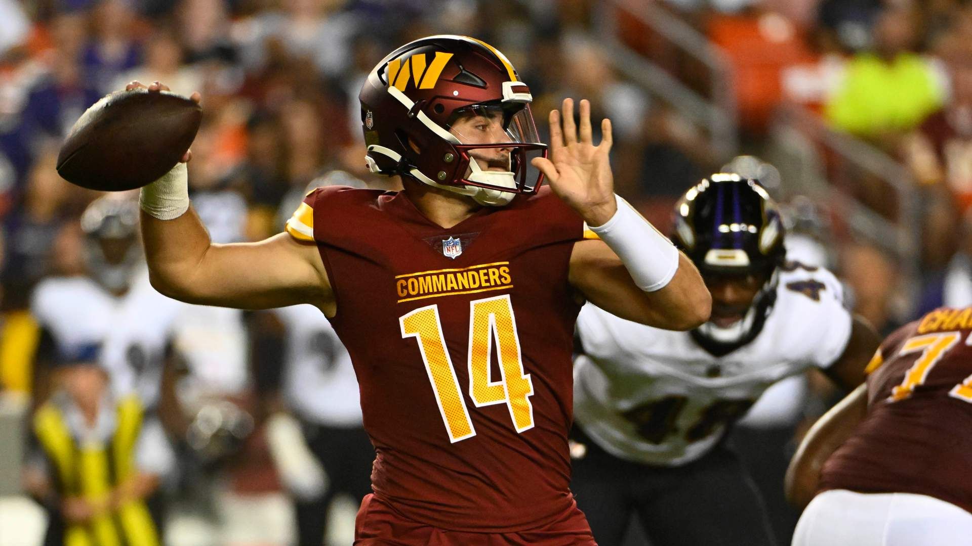 Aug 21, 2023; Landover, Maryland, USA; Washington Commanders quarterback Sam Howell (14) attempts a pass against the Baltimore Ravens during the first half at FedExField. Mandatory Credit: Brad Mills-USA TODAY Sports