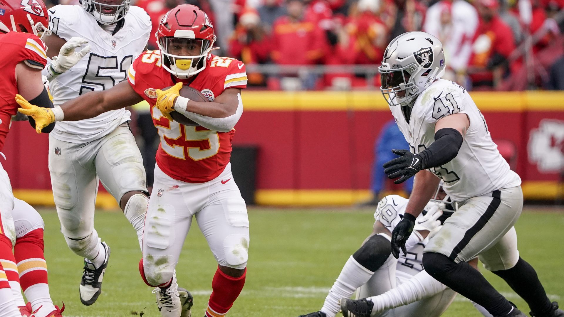 Dec 25, 2023; Kansas City, Missouri, USA; Kansas City Chiefs running back Clyde Edwards-Helaire (25) runs the ball against the Las Vegas Raiders during the game at GEHA Field at Arrowhead Stadium. Mandatory Credit: Denny Medley-USA TODAY Sports