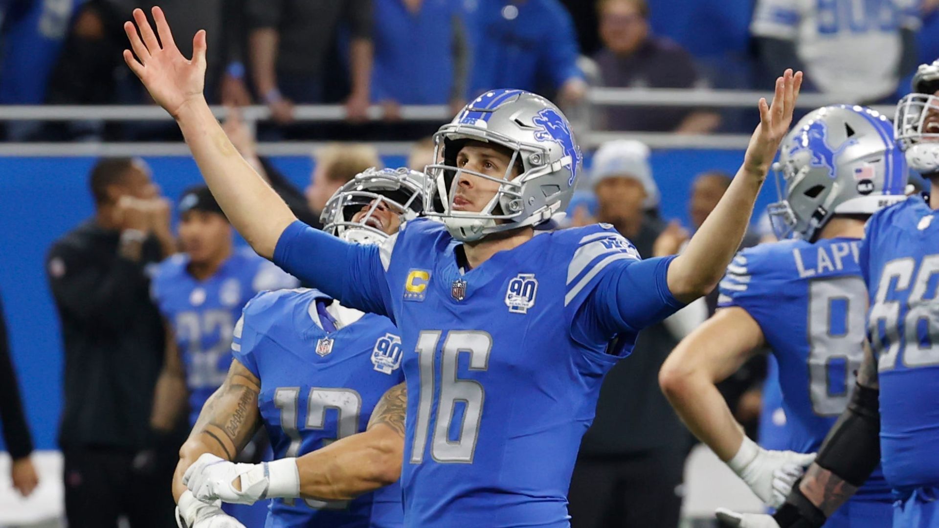 Detroit Lions quarterback Jared Goff (16) raises his arms as the Lions beat the L.A. Rams, 24-23 in the wild-card round of the NFC playoffs at Ford Field in Detroit on Sunday, January 14, 2023. Credit: Eric Seals / USA TODAY NETWORK