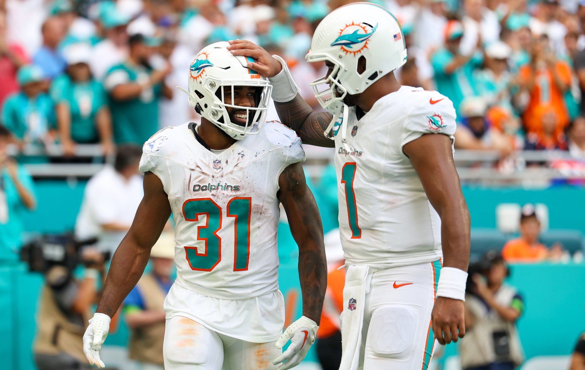 Sep 24, 2023; Miami Gardens, Florida, USA; Miami Dolphins quarterback Tua Tagovailoa (1) congratulates running back Raheem Mostert (31) after scoring a touchdown against the Denver Broncos in the third quarter at Hard Rock Stadium. Mandatory Credit: Nathan Ray Seebeck-USA TODAY Sports