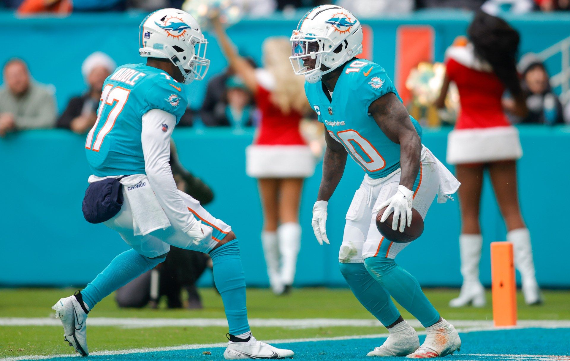 Dec 25, 2022; Miami Gardens, Florida, USA; Miami Dolphins wide receiver Tyreek Hill (10) celebrates with wide receiver Jaylen Waddle (17) after catching the football during the second quarter against the Green Bay Packers at Hard Rock Stadium. Mandatory Credit: Sam Navarro-USA TODAY Sports