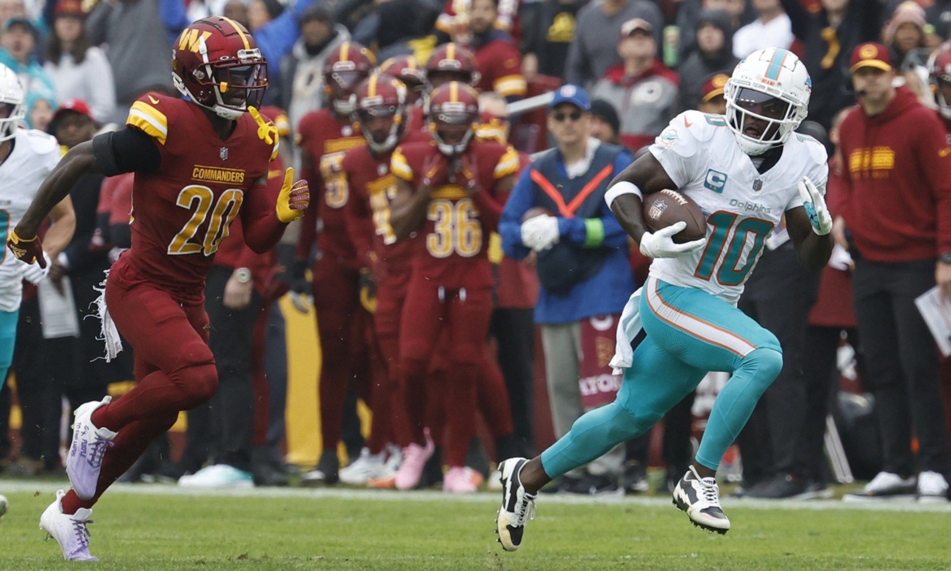 Dec 3, 2023; Landover, Maryland, USA; Miami Dolphins wide receiver Tyreek Hill (10) runs with the ball en route to a touchdown as Washington Commanders safety Jartavius Martin (20) chases during the first quarter at FedExField. Mandatory Credit: Geoff Burke-USA TODAY Sports