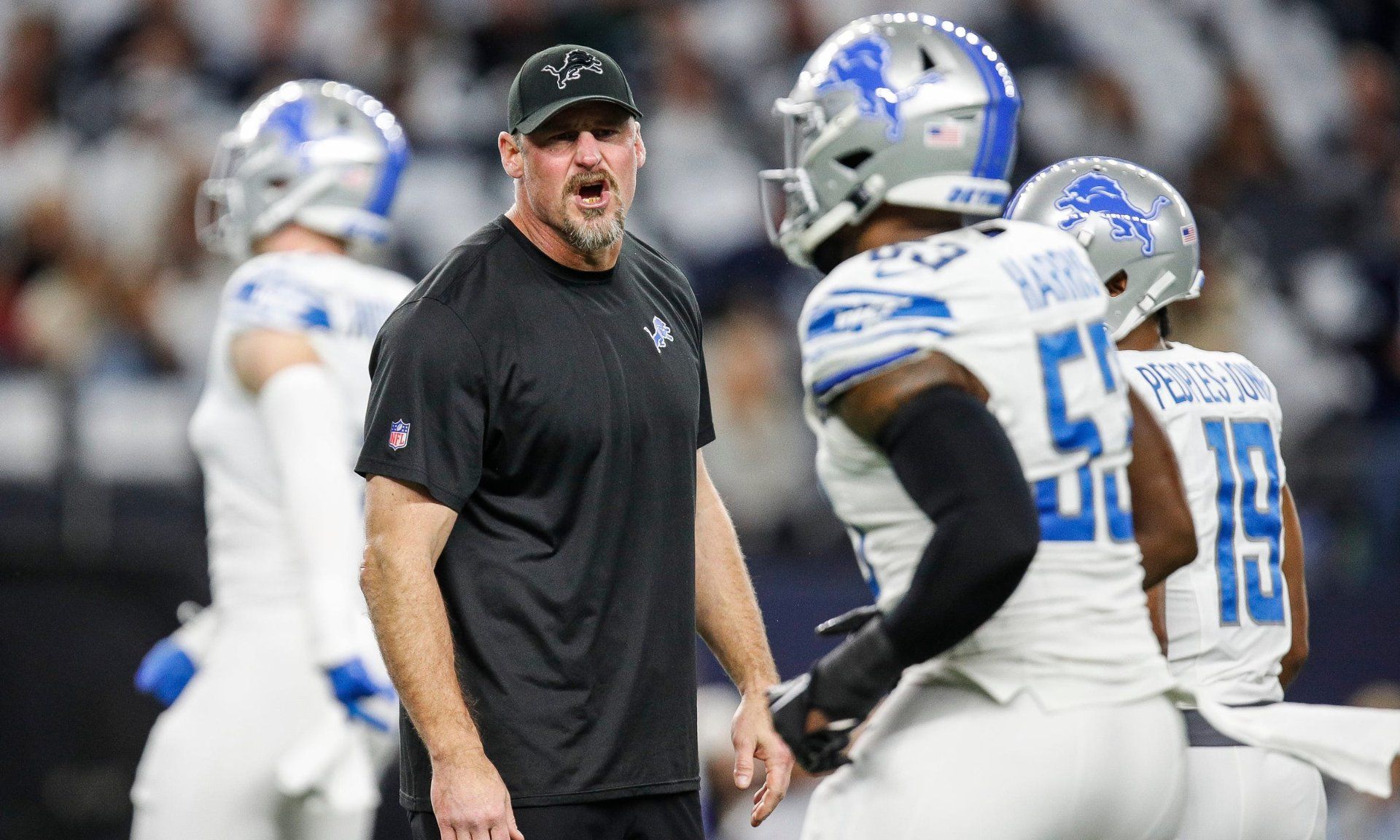 Detroit Lions head coach Dan Campbell during warmups before the Dallas Cowboys game at AT&T Stadium in Arlington, Texas on Saturday, Dec. 30, 2023.