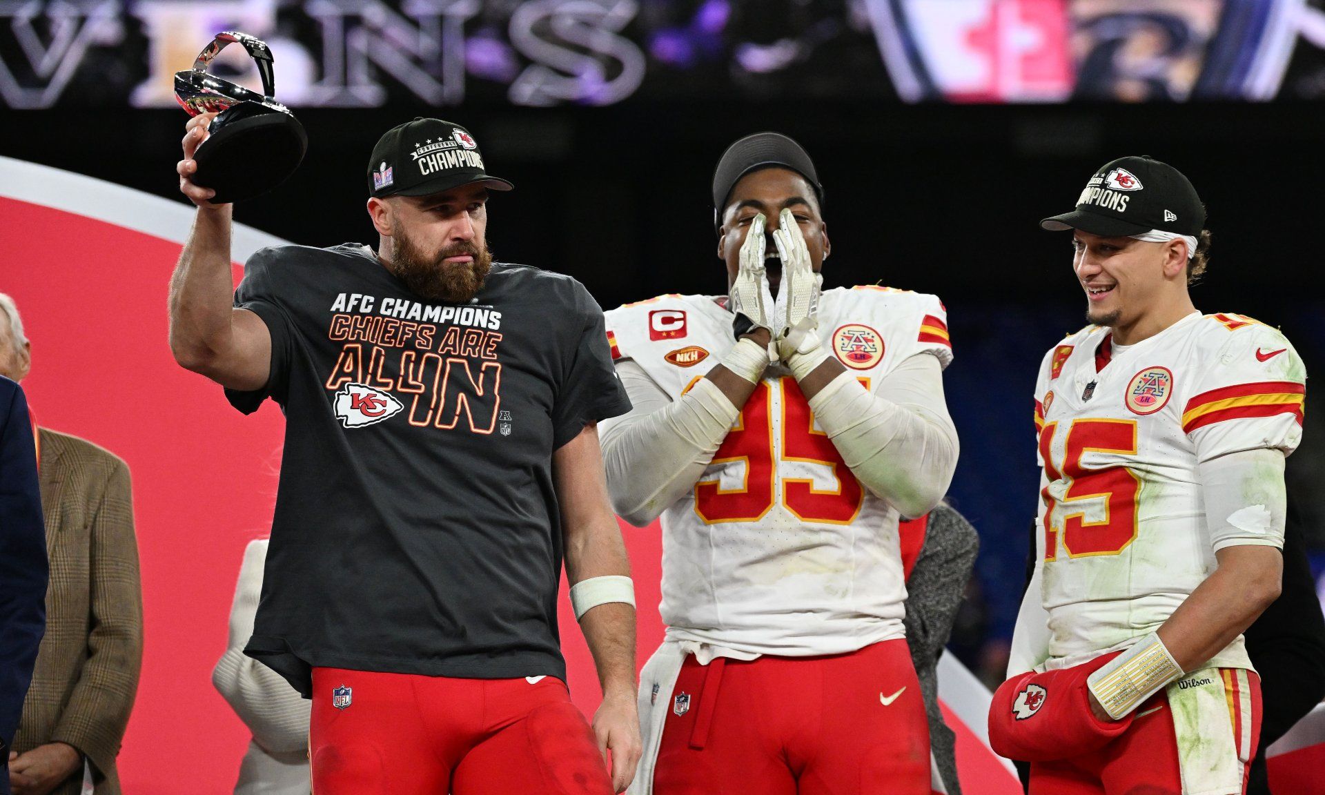 Jan 28, 2024; Baltimore, Maryland, USA; Kansas City Chiefs tight end Travis Kelce (87) holds the Lamar Hunt trophy after winning the AFC Championship football game against the Baltimore Ravens at M&T Bank Stadium. Mandatory Credit: Tommy Gilligan-USA TODAY Sports