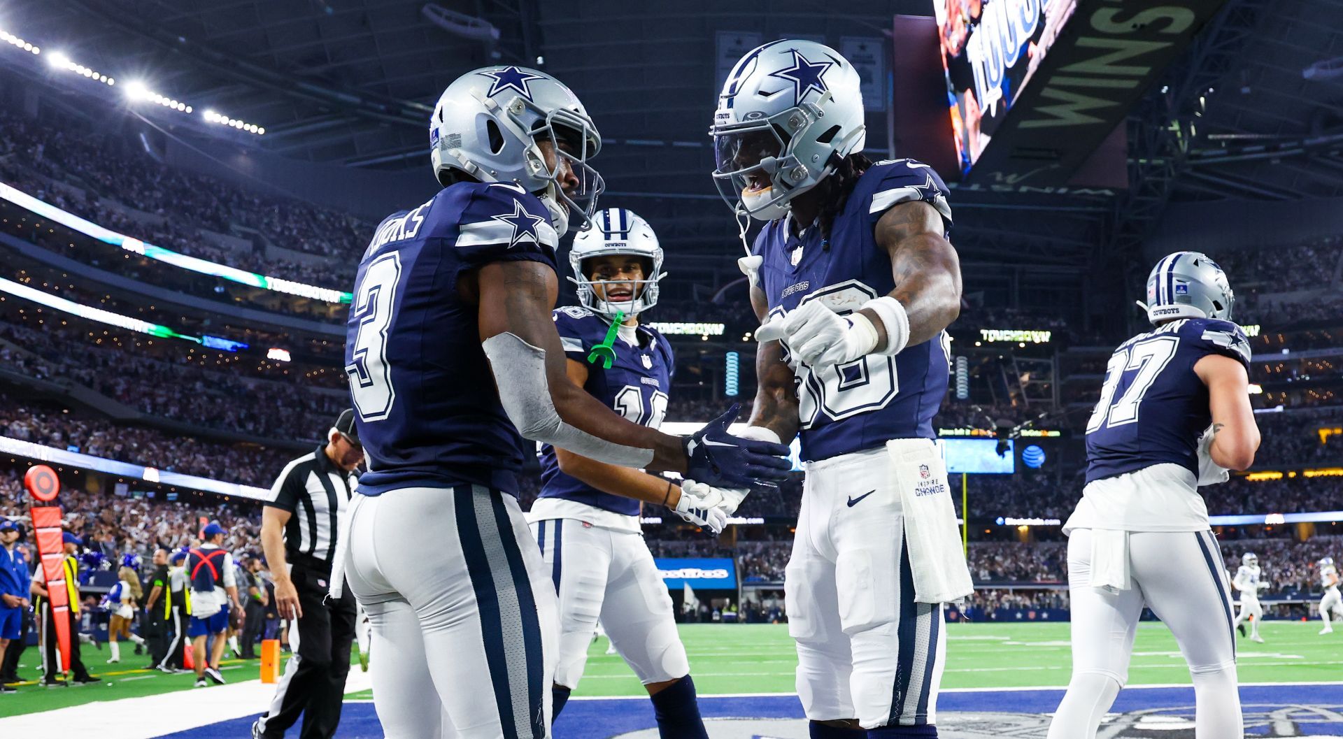 Dec 30, 2023; Arlington, Texas, USA; Dallas Cowboys wide receiver Brandin Cooks (3) celebrates with Dallas Cowboys wide receiver CeeDee Lamb (88) after making a touchdown catch during the second half against the Detroit Lions at AT&T Stadium. Mandatory Credit: Kevin Jairaj-USA TODAY Sports