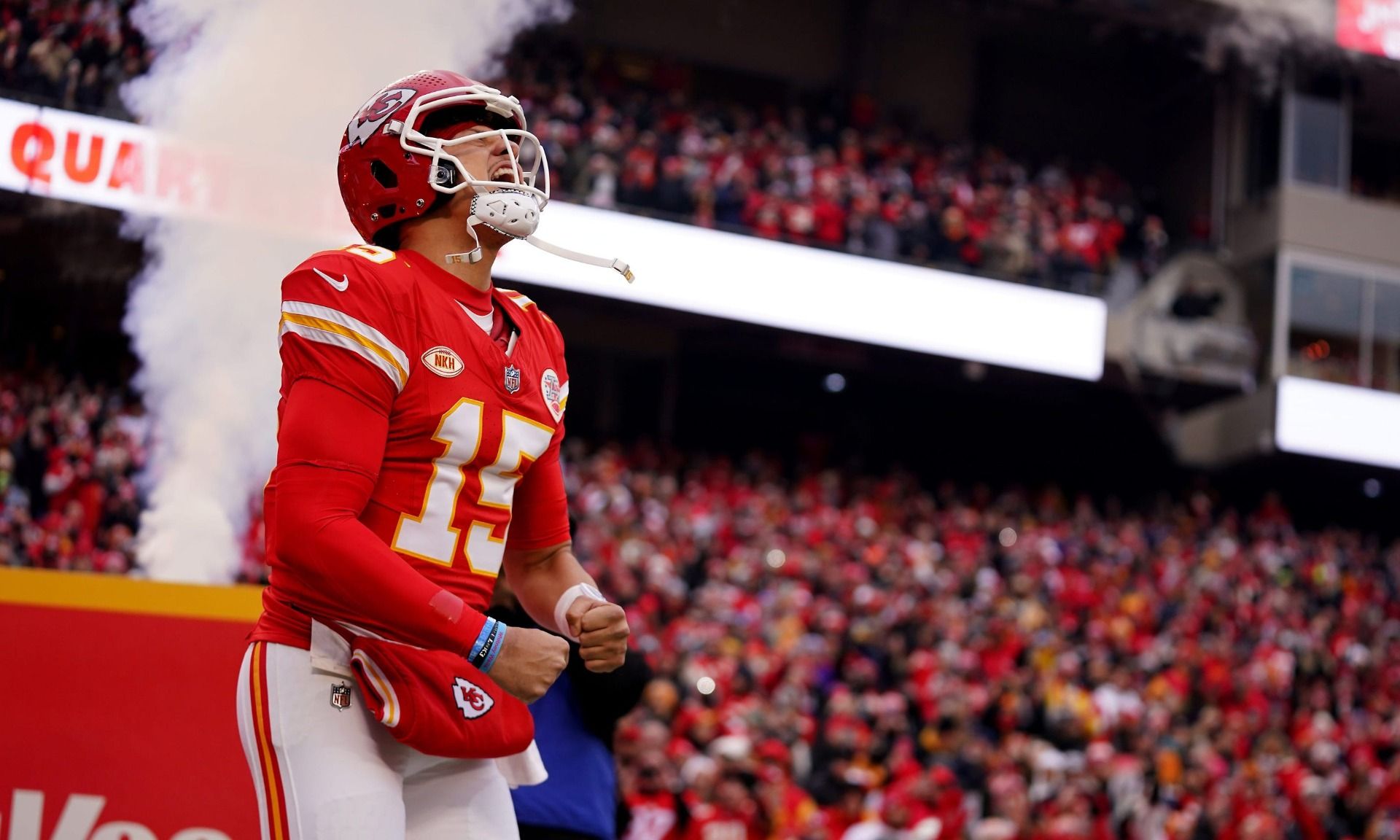 Kansas City Chiefs quarterback Patrick Mahomes (15) in introduced prior a Week 17 NFL football game between the Cincinnati Bengals and the Kansas City Chiefs, Sunday, Dec. 31, 2023, at GEHA Field at Arrowhead Stadium in Kansas City, Mo.