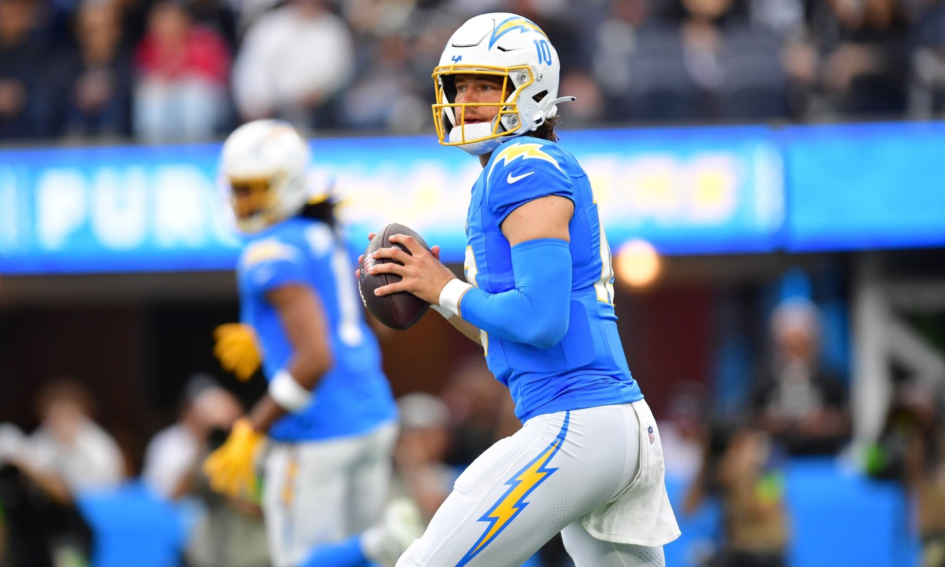 Oct 1, 2023; Inglewood, California, USA; Los Angeles Chargers quarterback Justin Herbert (10) drops back to pass against the Las Vegas Raiders during the first half at SoFi Stadium. Mandatory Credit: Gary A. Vasquez-USA TODAY Sports