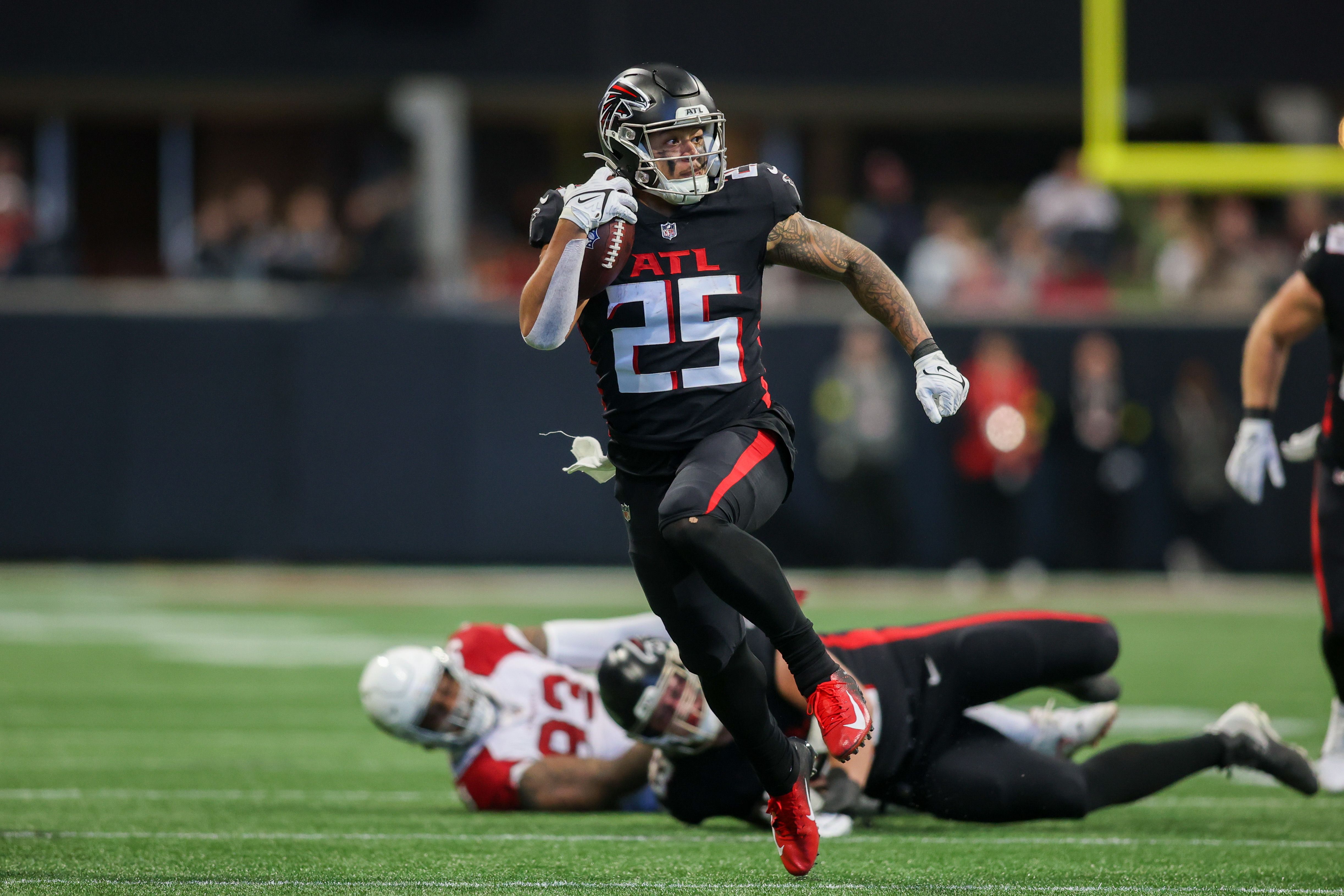 Jan 1, 2023; Atlanta, Georgia, USA; Atlanta Falcons running back Tyler Allgeier (25) runs the ball against the Arizona Cardinals in the first half at Mercedes-Benz Stadium. Mandatory Credit: Brett Davis-USA TODAY Sports