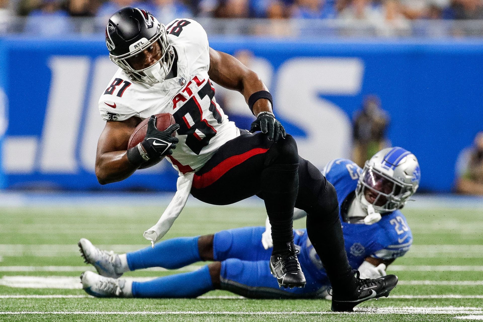 Atlanta Falcons tight end Jonnu Smith (81) makes a catch against Detroit Lions cornerback Jerry Jacobs (23) during the second half at Ford Field in Detroit on Sunday, Sept. 24, 2023.