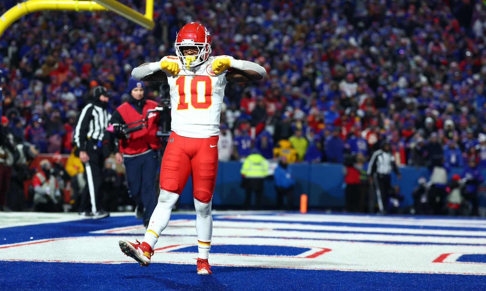 Jan 21, 2024; Orchard Park, New York, USA; Kansas City Chiefs running back Isiah Pacheco (10) reacts after scoring a touchdown against the Buffalo Bills during the second half for the 2024 AFC divisional round game at Highmark Stadium. Mandatory Credit: Mark J. Rebilas-USA TODAY Sports