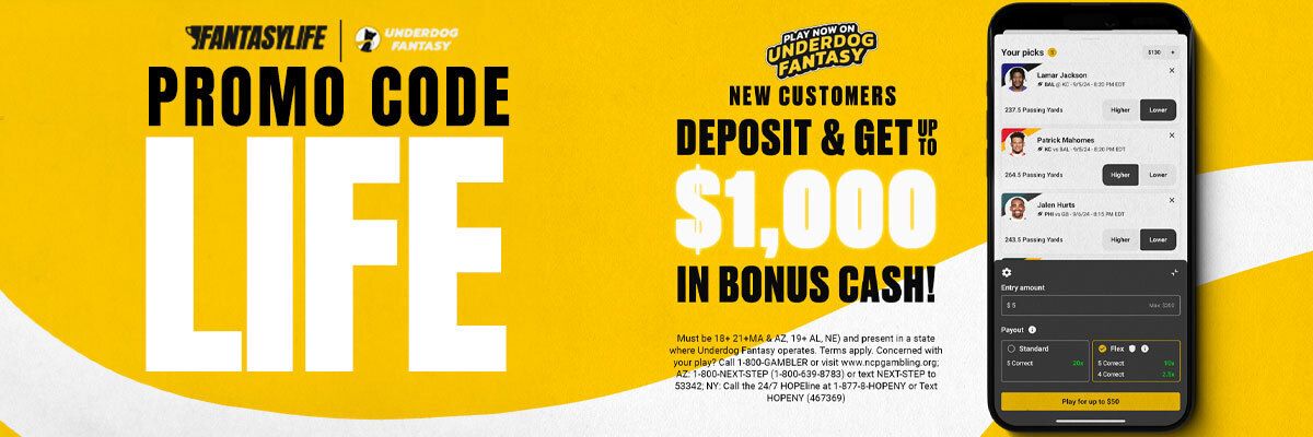 Get ready to make your Pick'Em picks for the upcoming NFL season with Underdog Fantasy! It’s time to put your predictions to the test and enjoy this season with an extra boost! Sign up today using our promo code: LIFE and you could earn up to $1,000 Bonus Cash on your first deposit! Start the NFL season off right, and take advantage of this incredible offer on Underdog Fantasy!