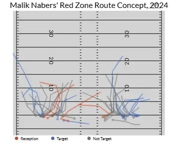 With talent, utilization, and quarterbacking (hopefully) covered, getting an alpha wideout to 8 touchdowns should be easy, depending on red-zone gameplanning. You guessed it! Nabers was heavily involved inside the red zone, earning one-third of all the Giants’ targets, most importantly in a variety of ways, displayed in the route concept chart below. Inside and outside routes with fades and hitches from either hashmark, including slot work on both sides.