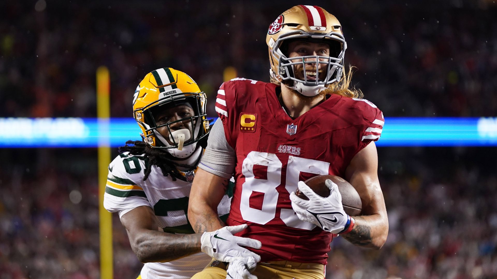 January 20, 2024; Santa Clara, CA, USA; San Francisco 49ers tight end George Kittle (85) celebrates with wide receiver Brandon Aiyuk (11) after scoring a touchdown against the Green Bay Packers during the second quarter in a 2024 NFC divisional round game at Levi's Stadium. Mandatory Credit: Kyle Terada-USA TODAY Sports