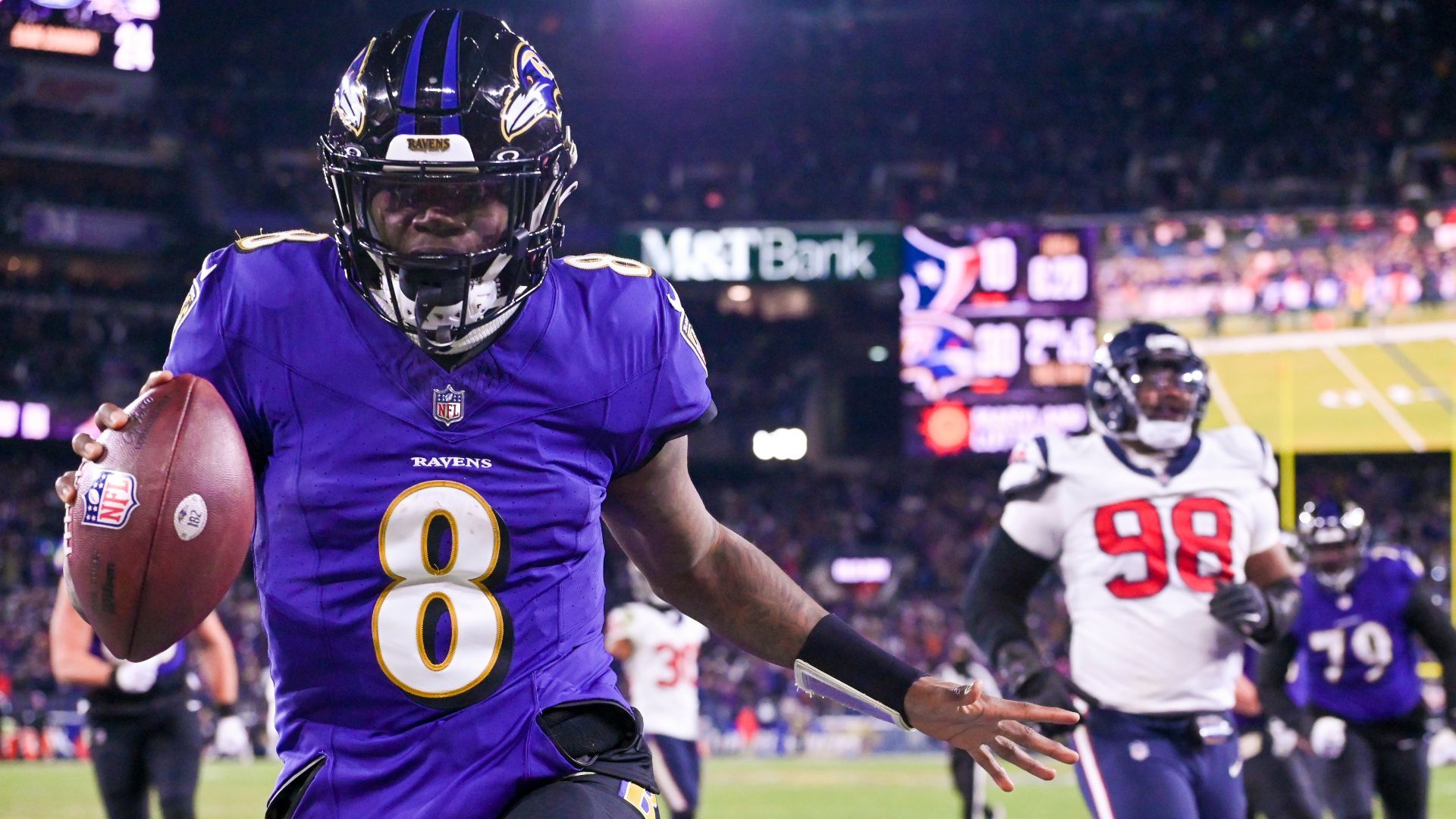 Jan 20, 2024; Baltimore, MD, USA; Baltimore Ravens quarterback Lamar Jackson (8) runs the ball to score a touchdown against Houston Texans defensive tackle Sheldon Rankins (98) and defensive tackle Khalil Davis (94) during the fourth quarter of a 2024 AFC divisional round game at M&T Bank Stadium. Mandatory Credit: Mitch Stringer-USA TODAY Sports