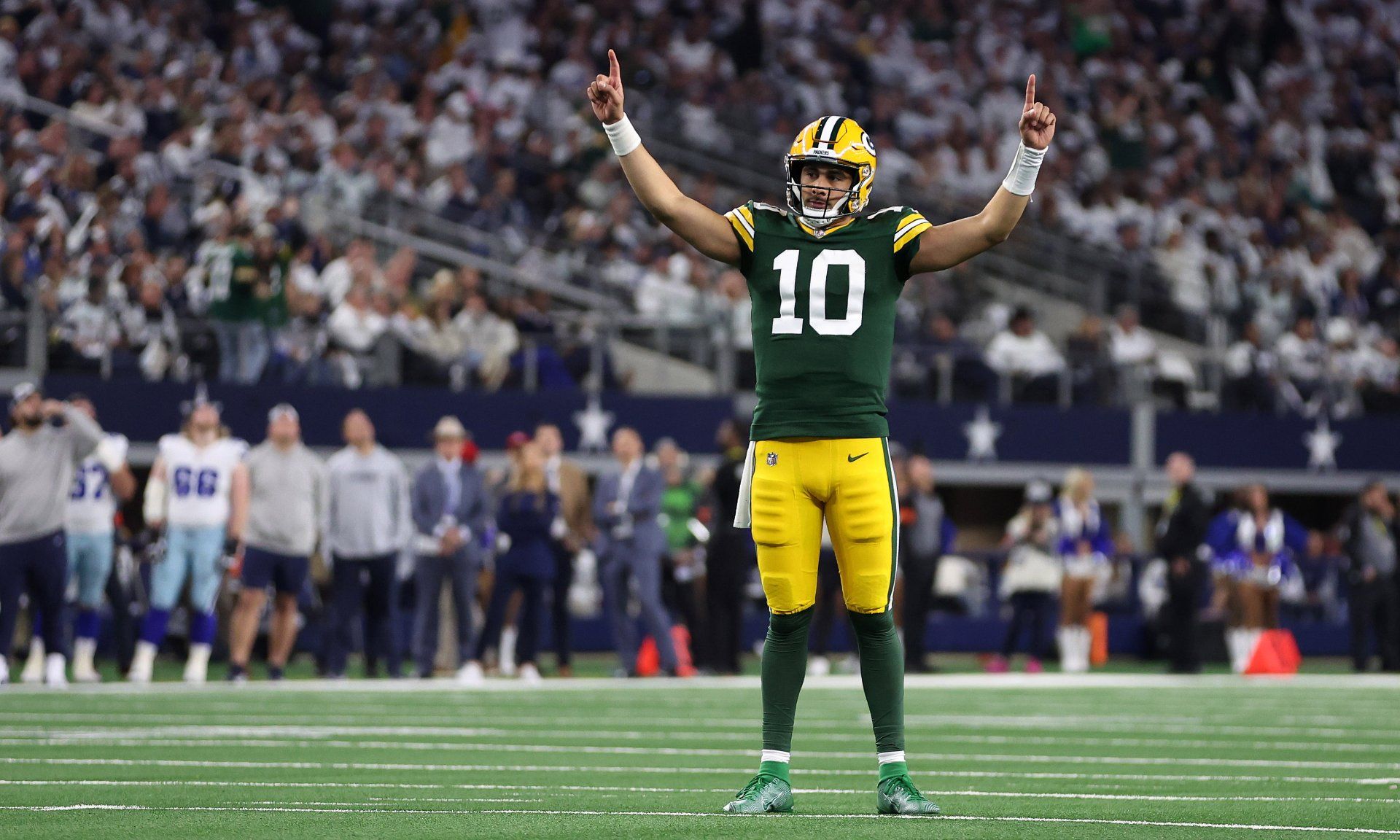 Jan 14, 2024; Arlington, Texas, USA; Green Bay Packers quarterback Jordan Love (10) reacts after a touchdown against the Dallas Cowboys during the second half of the 2024 NFC wild card game at AT&T Stadium. Mandatory Credit: Tim Heitman-USA TODAY Sports
