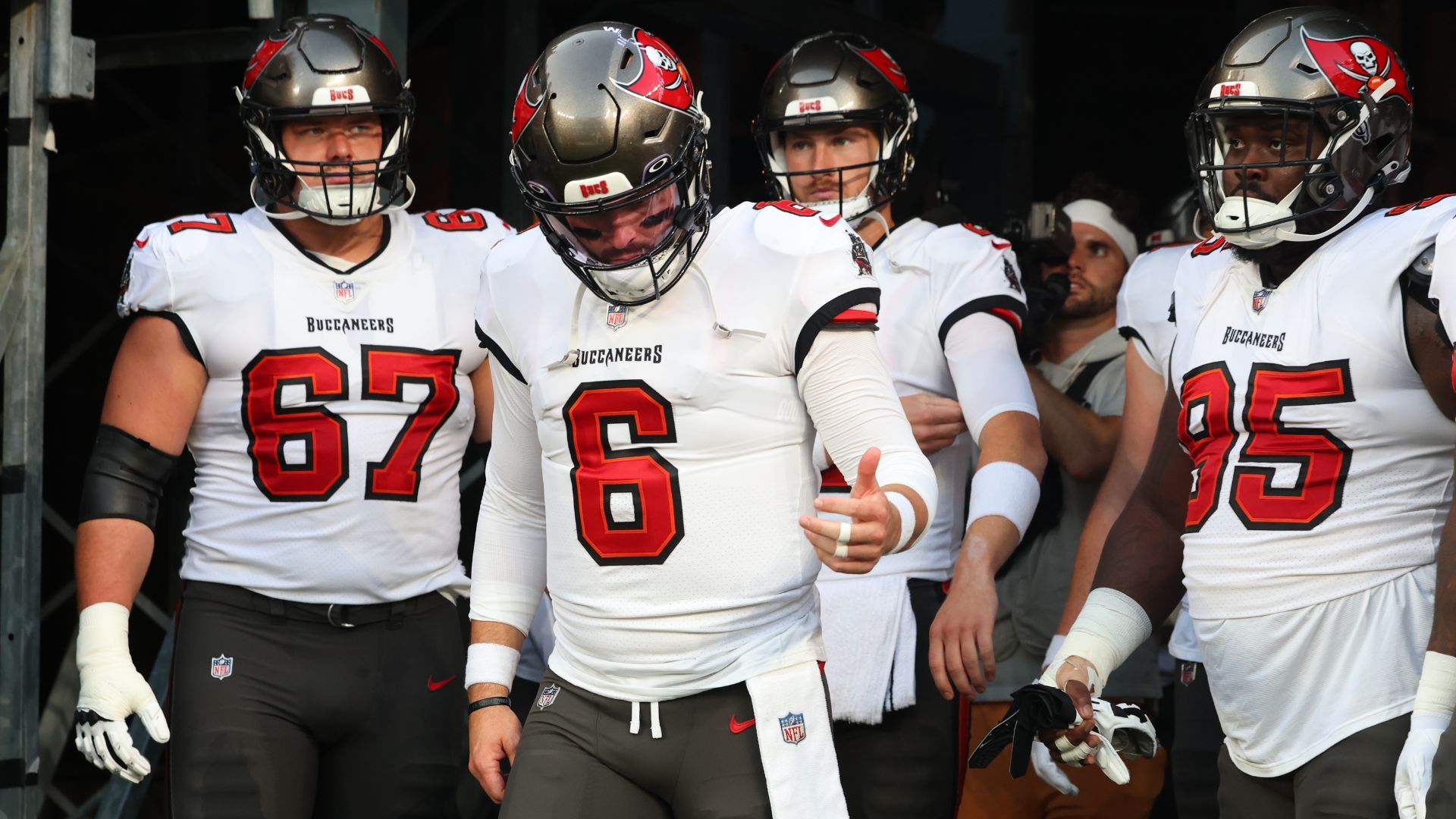 Aug 19, 2023; East Rutherford, New Jersey, USA; Tampa Bay Buccaneers quarterback Baker Mayfield (6) leads the team out for the start of the first half against the New York Jets at MetLife Stadium. Mandatory Credit: Ed Mulholland-USA TODAY Sports