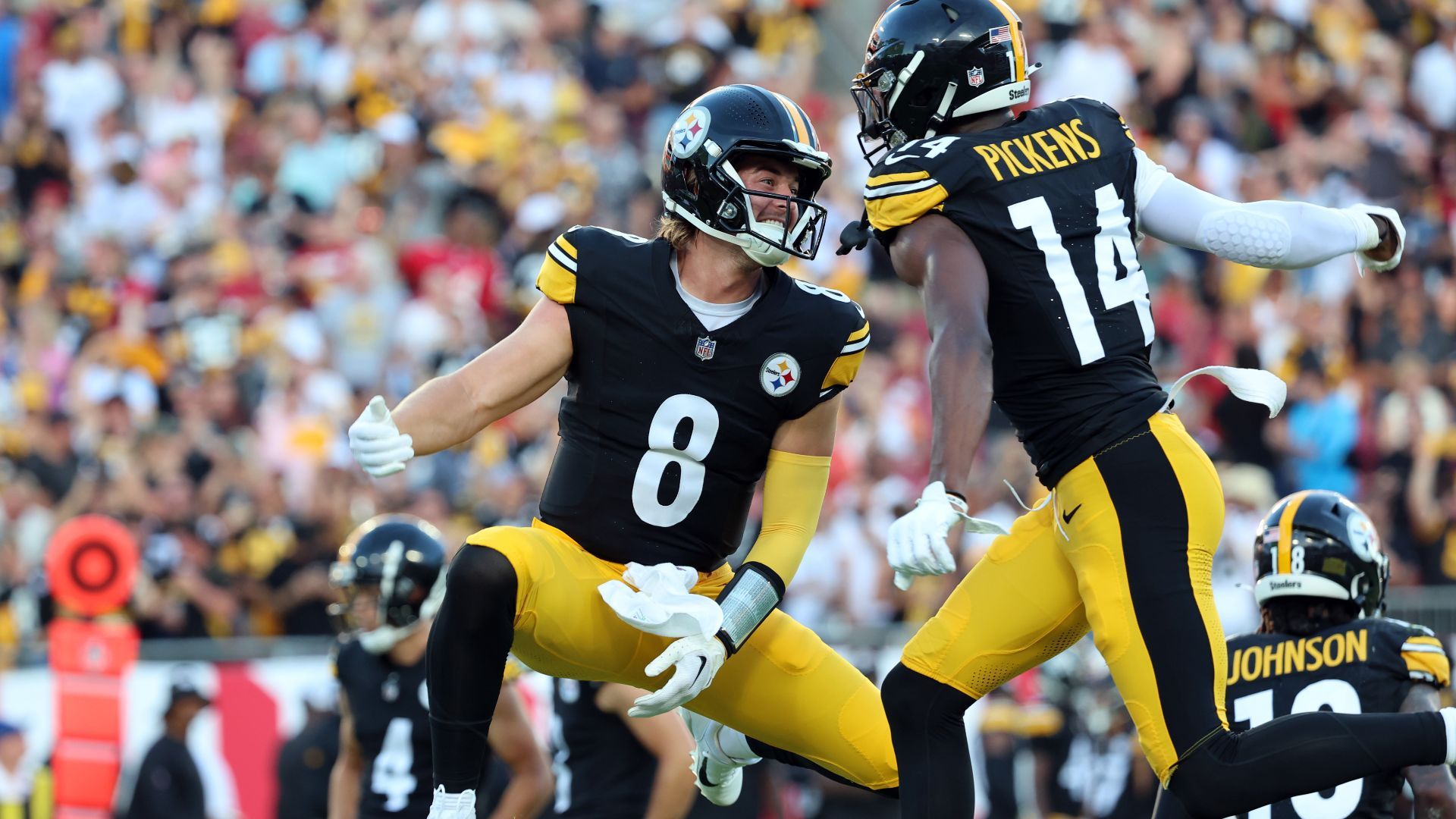Aug 11, 2023; Tampa, Florida, USA; Pittsburgh Steelers wide receiver George Pickens (14) celebrates with quarterback Kenny Pickett (8) after scoring a touchdown against the Tampa Bay Buccaneers during the first quarter at Raymond James Stadium. Mandatory Credit: Kim Klement Neitzel-USA TODAY Sports