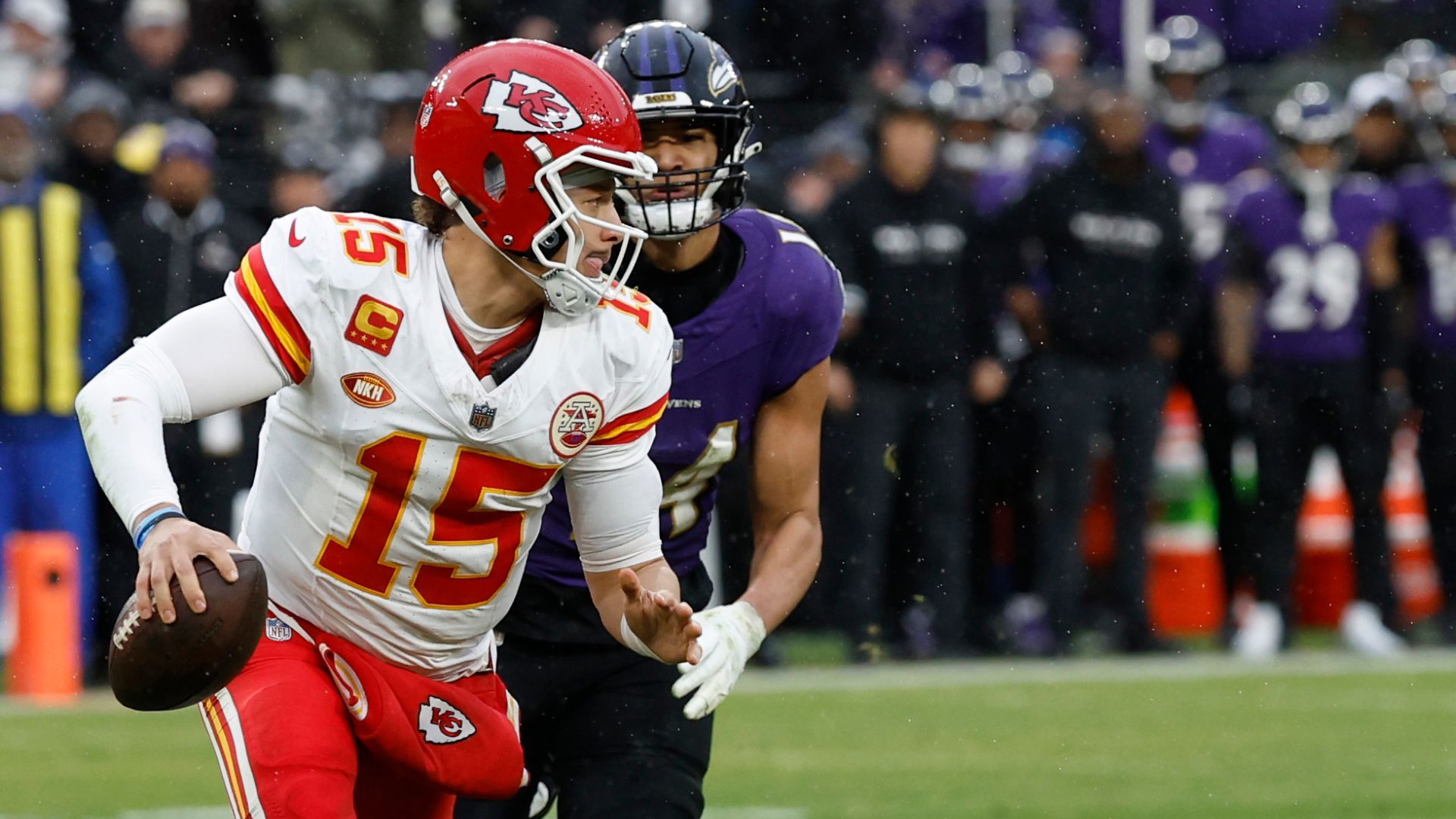 Jan 28, 2024; Baltimore, Maryland, USA; Kansas City Chiefs quarterback Patrick Mahomes (15) scrambles against the Baltimore Ravens in the AFC Championship football game at M&T Bank Stadium. Mandatory Credit: Geoff Burke-USA TODAY Sports