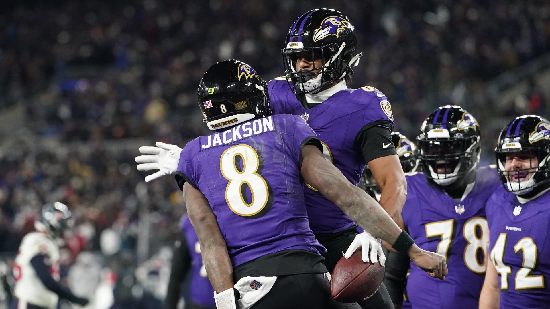 Jan 20, 2024; Baltimore, MD, USA; Baltimore Ravens tight end Isaiah Likely (80) celebrates with quarterback Lamar Jackson (8) after catching a pass for a touchdown against the Houston Texans during the fourth quarter of a 2024 AFC divisional round game at M&T Bank Stadium. Mandatory Credit: Mitch Stringer-USA TODAY Sports