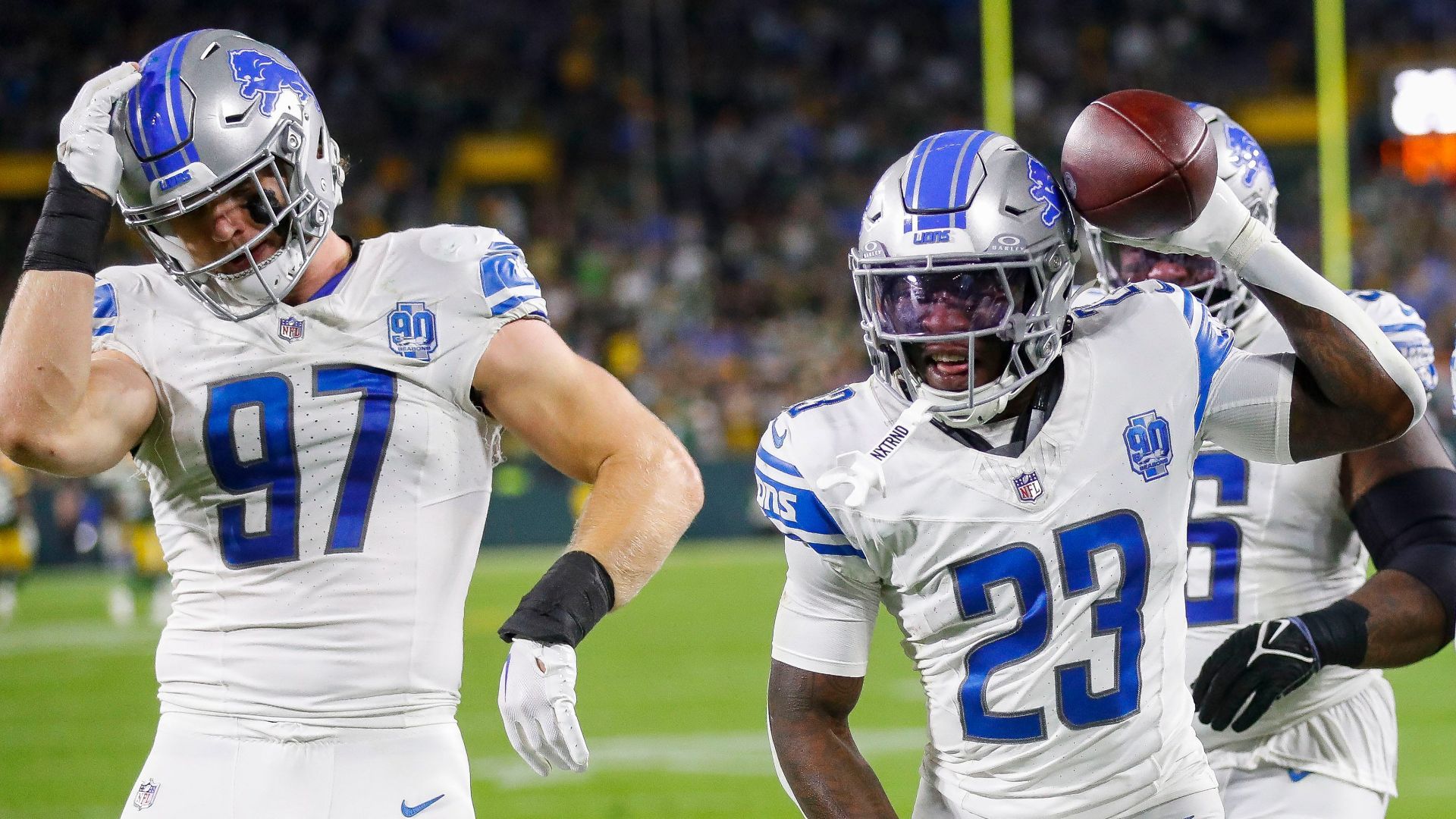 Detroit Lions cornerback Jerry Jacobs (23) celebrates with defensive end Aidan Hutchinson (97) after intercepting a pass against the Green Bay Packers during their football game on Thursday, September 28, 2023, at Lambeau Field in Green Bay, Wis. The Lions won the game, 34-20. Tork Mason/USA TODAY NETWORK-Wisconsin