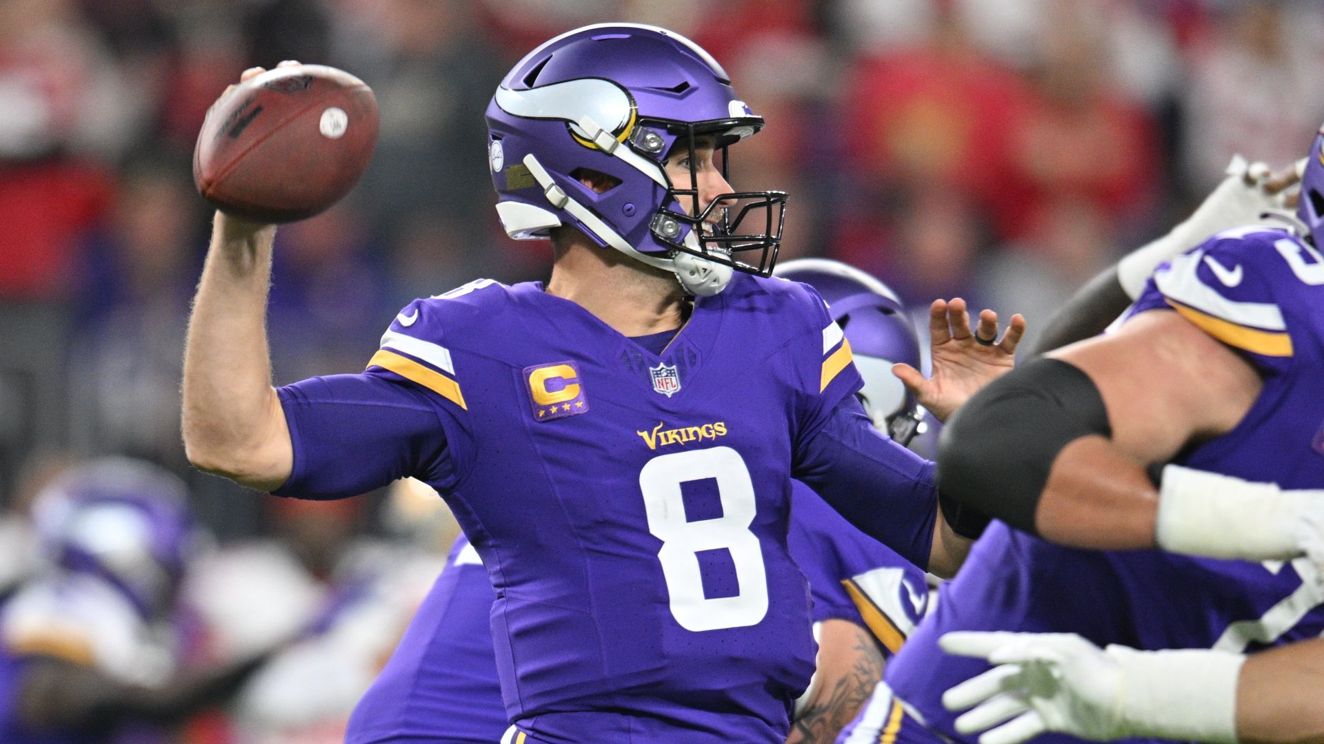 Oct 23, 2023; Minneapolis, Minnesota, USA; Minnesota Vikings quarterback Kirk Cousins (8) throws a pass against the San Francisco 49ers during the first quarter at U.S. Bank Stadium. Mandatory Credit: Jeffrey Becker-USA TODAY Sports