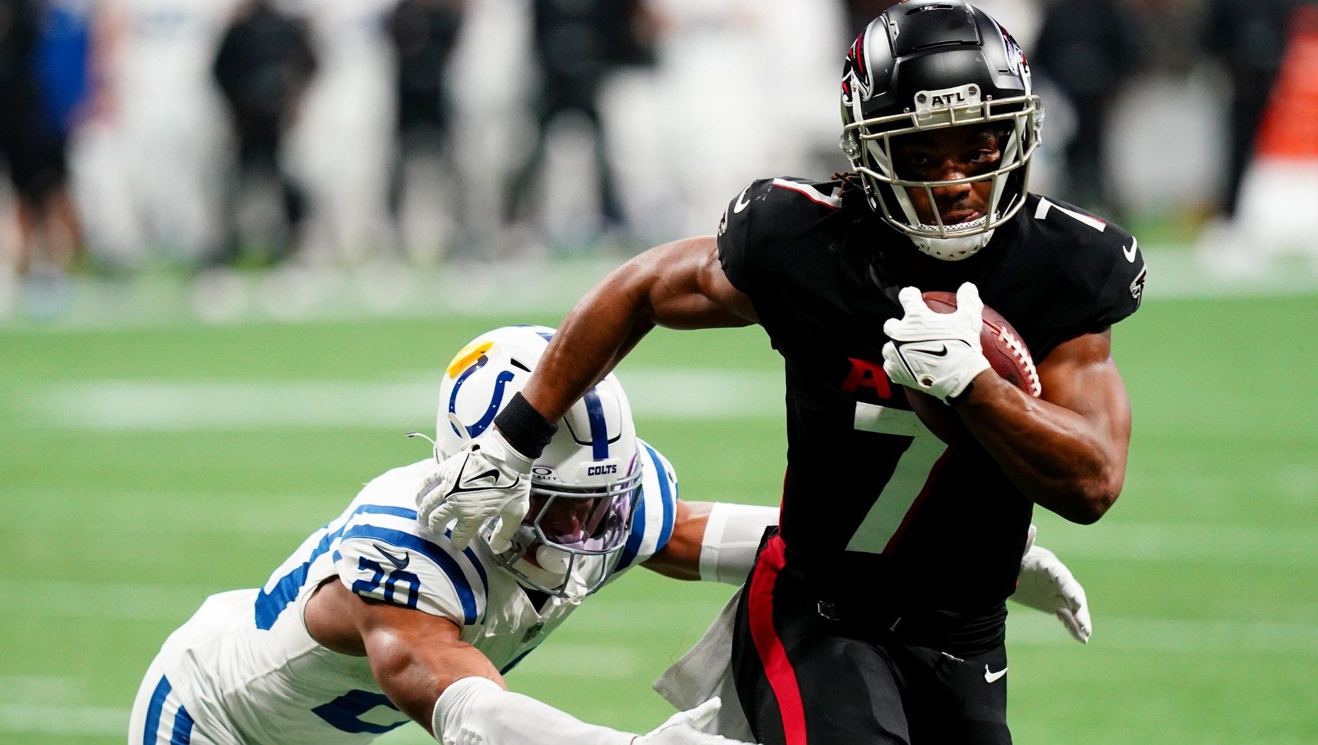Sep 17, 2023; Atlanta, Georgia, USA; Atlanta Falcons running back Bijan Robinson (7) runs the ball against the Green Bay Packers in the first quarter at Mercedes-Benz Stadium. Mandatory Credit: Brett Davis-USA TODAY Sports