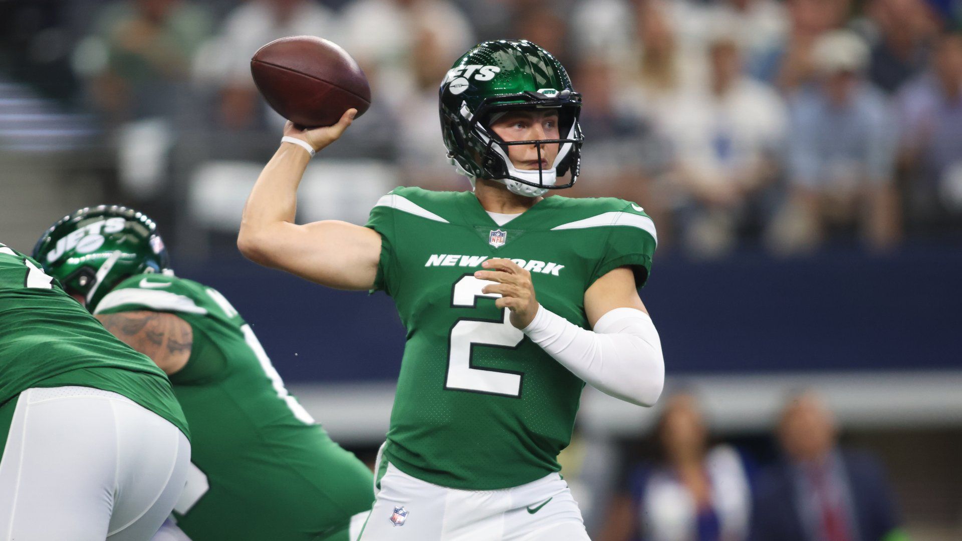 Sep 17, 2023; Arlington, Texas, USA; New York Jets quarterback Zach Wilson (2) throws a pass in the first quarter against the Dallas Cowboys at AT&T Stadium. Mandatory Credit: Tim Heitman-USA TODAY Sports