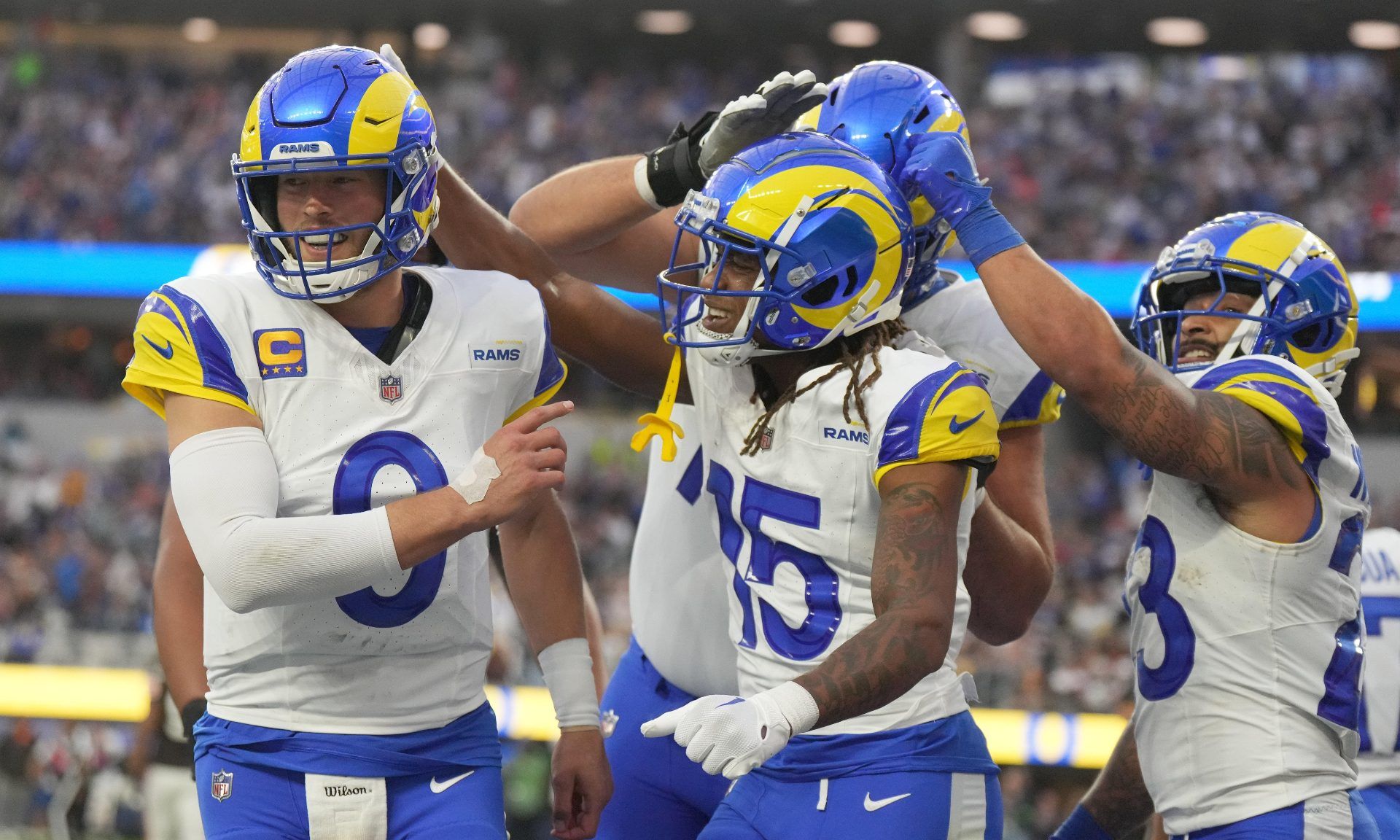 Dec 3, 2023; Inglewood, California, USA; Los Angeles Rams wide receiver Demarcus Robinson (15) celebrates with quarterback Matthew Stafford (9) and running back Kyren Williams (23) after catching a 7-yard touchdown pass in the third quarter against the Cleveland Browns at SoFi Stadium. Mandatory Credit: Kirby Lee-USA TODAY Sports