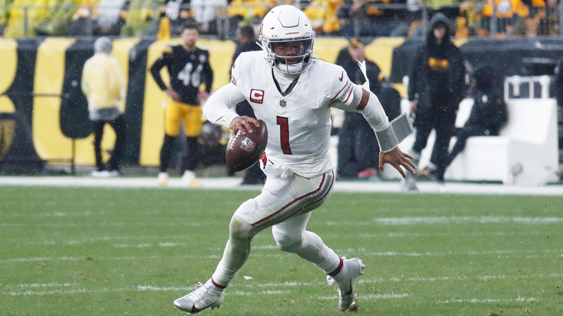 Dec 3, 2023; Pittsburgh, Pennsylvania, USA; Arizona Cardinals quarterback Kyler Murray (1) scrambles with the ball against the Pittsburgh Steelers during the third quarter at Acrisure Stadium. Mandatory Credit: Charles LeClaire-USA TODAY Sports