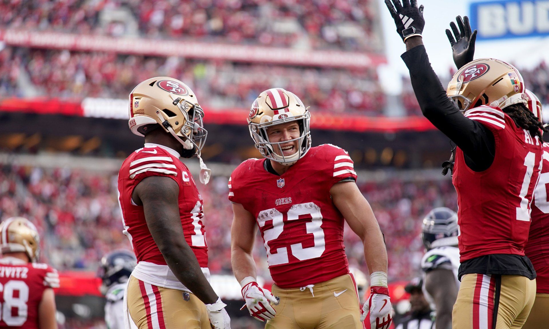 Dec 10, 2023; Santa Clara, California, USA; San Francisco 49ers running back Christian McCaffrey (23) stands next to wide receiver Deebo Samuel (19) and wide receiver Brandon Aiyuk (11) after the 49ers picked up a first down near the end zone against the Seattle Seahawks in the third quarter at Levi's Stadium. Mandatory Credit: Cary Edmondson-USA TODAY Sports