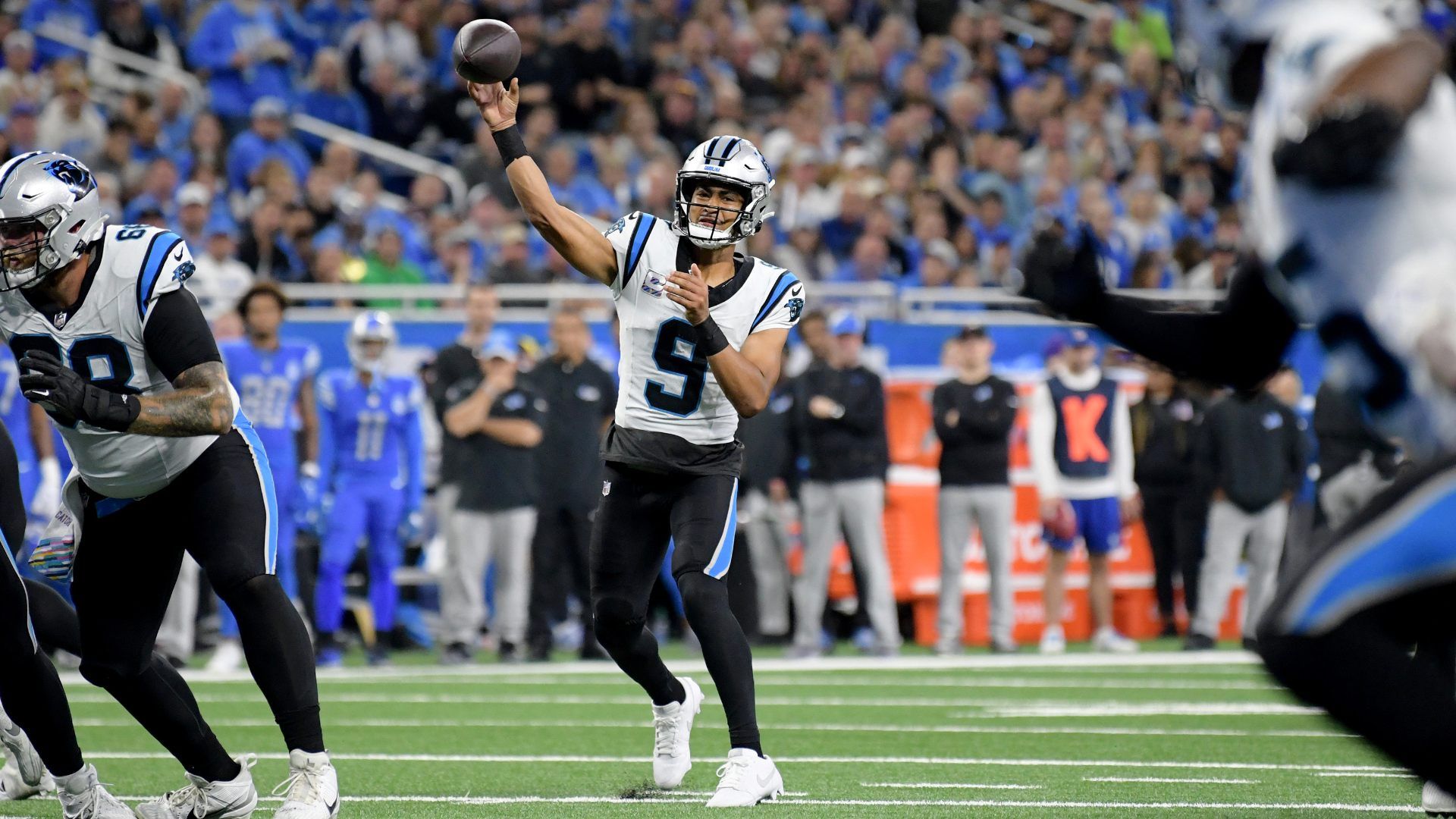 Oct 8, 2023; Detroit, Michigan, USA; Carolina Panthers quarterback Bryce Young (9) throws a touchdown pass to tight end Tommy Tremble (82) (not pictured) against the Detroit Lions in the second quarter at Ford Field. Mandatory Credit: Lon Horwedel-USA TODAY Sports