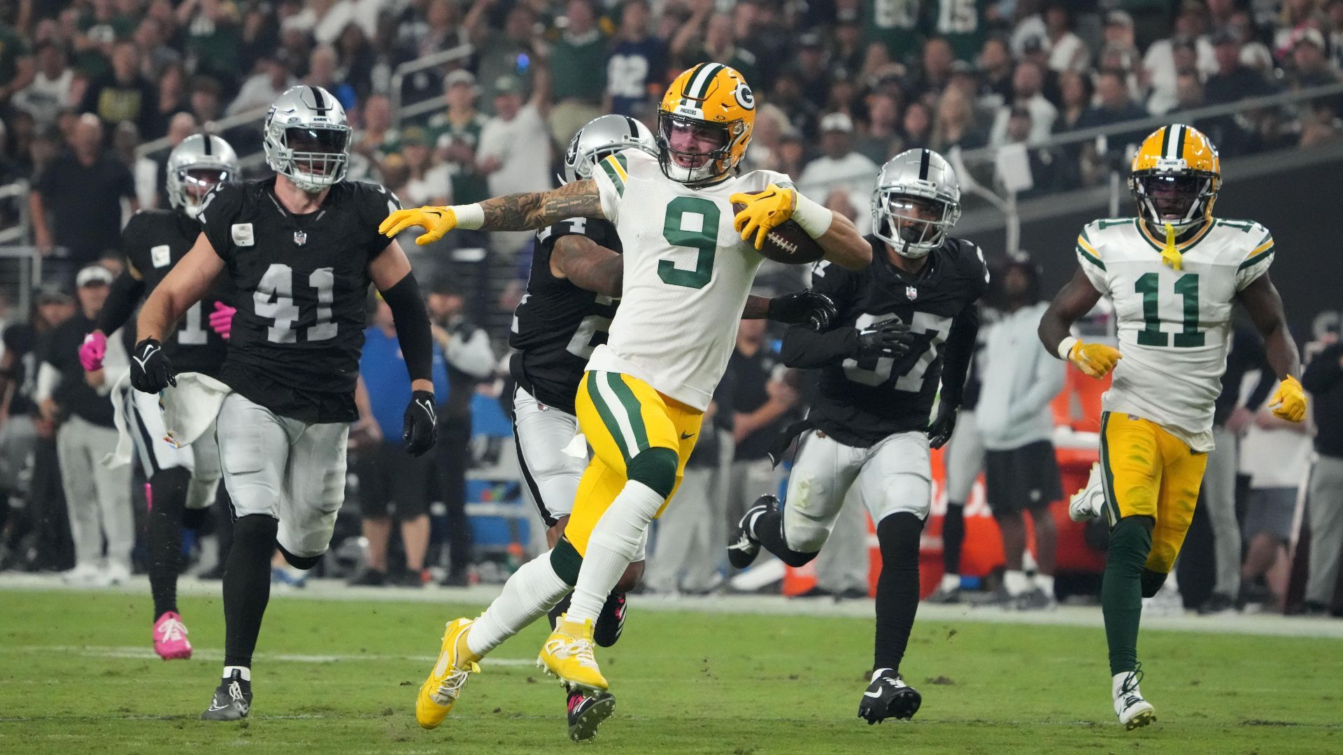 Oct 9, 2023; Paradise, Nevada, USA; Green Bay Packers wide receiver Christian Watson (9) is pursued by Las Vegas Raiders linebacker Robert Spillane (41), cornerback Marcus Peters (24) and cornerback Tyler Hall (37) on a 77-yard reception in the second half at Allegiant Stadium. Mandatory Credit: Kirby Lee-USA TODAY Sports