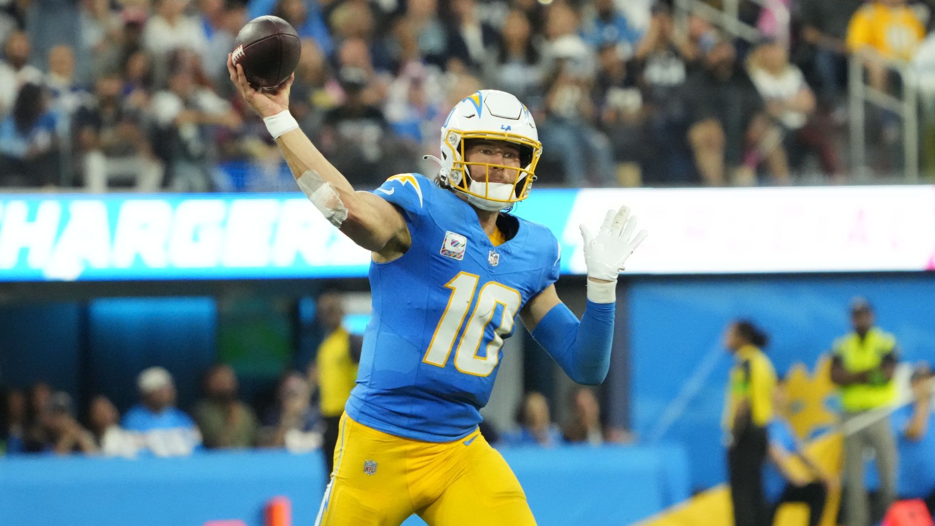 Oct 16, 2023; Inglewood, California, USA; Los Angeles Chargers quarterback Justin Herbert (10) throws the ball against the Dallas Cowboys in the second half at SoFi Stadium. Mandatory Credit: Kirby Lee-USA TODAY Sports