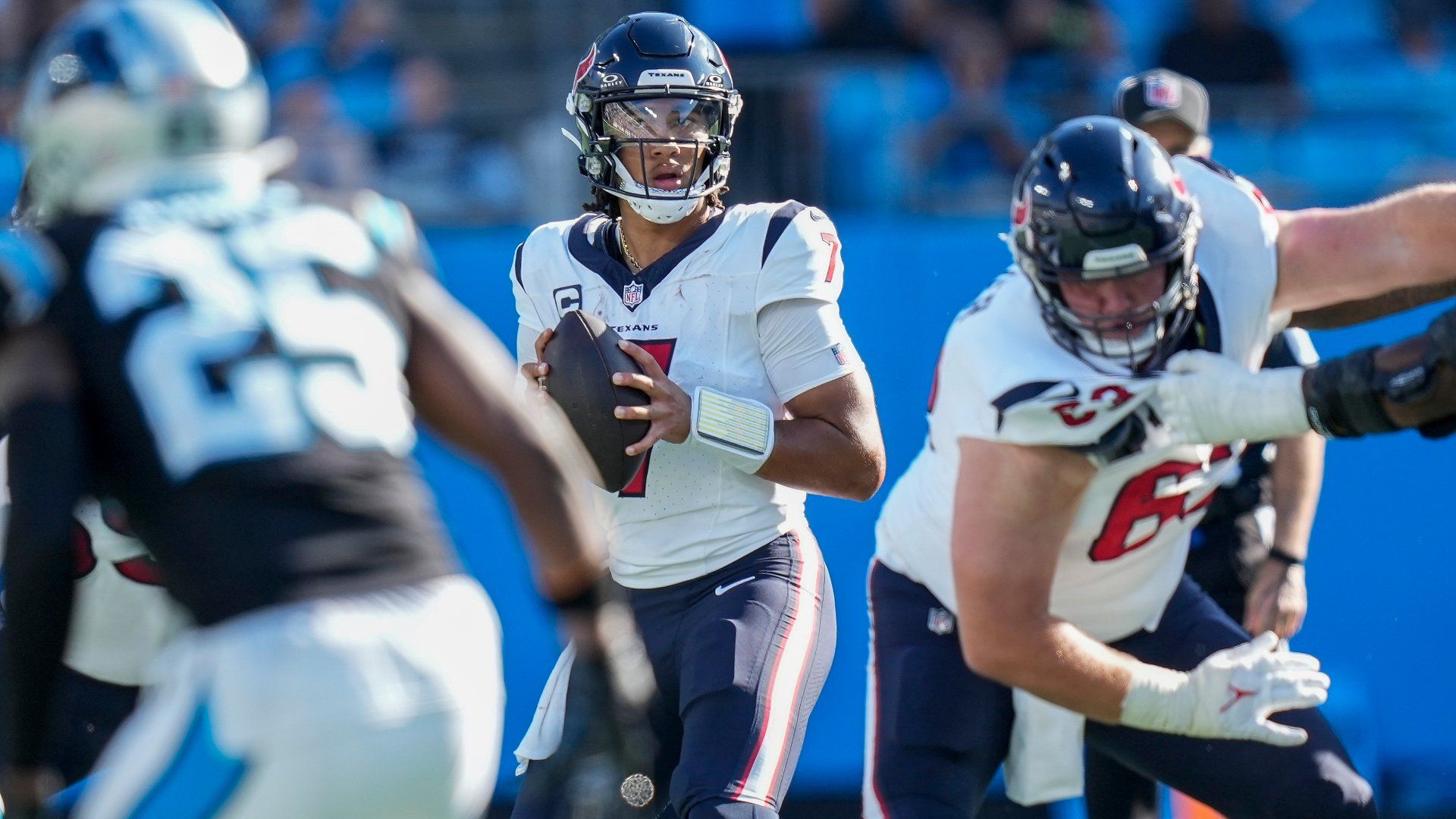 Oct 29, 2023; Charlotte, North Carolina, USA; Houston Texans quarterback C.J. Stroud (7) drops back to pass against the Carolina Panthers during the second half at Bank of America Stadium. Mandatory Credit: Jim Dedmon-USA TODAY Sports