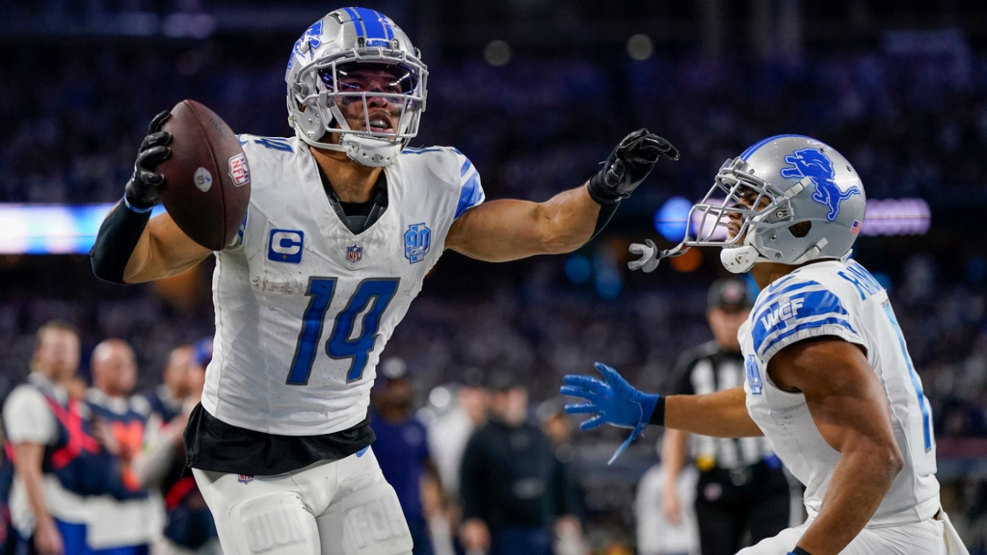 Detroit Lions wide receiver Amon-Ra St. Brown (14) celebrates his touchdown catch with wide receiver Kalif Raymond during the second half of an NFL football game against the Dallas Cowboys, Saturday, Dec. 30, 2023, in Arlington, Texas. The Cowboys won 20-19. (AP Photo/Sam Hodde)