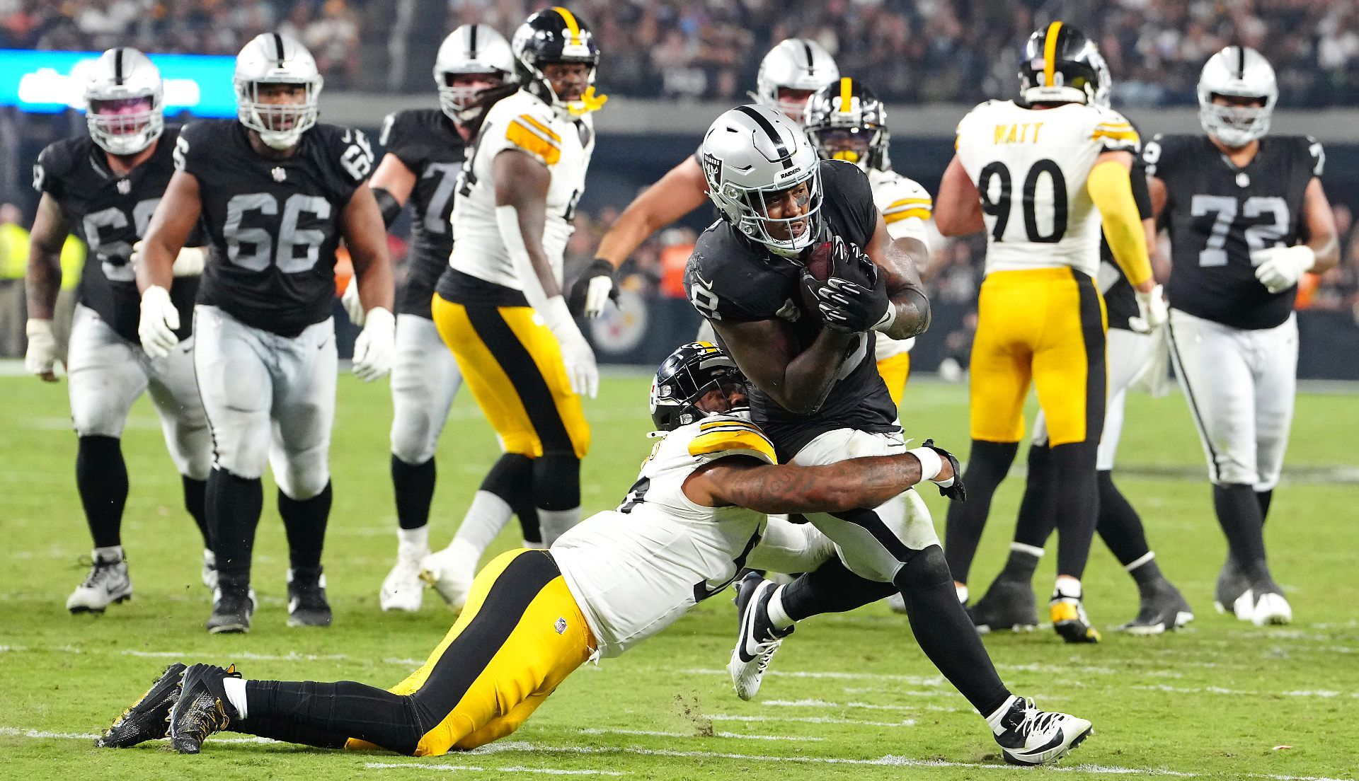 Sep 24, 2023; Paradise, Nevada, USA; Las Vegas Raiders running back Josh Jacobs (8) is tackled by Pittsburgh Steelers linebacker Elandon Roberts (50) during the fourth quarter at Allegiant Stadium. Mandatory Credit: Stephen R. Sylvanie-USA TODAY Sports