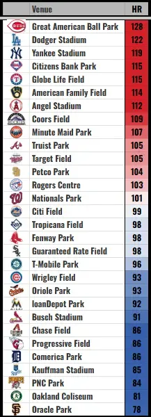 Per Baseball Savant, Statcast park effects show the observed effect of each displayed stat based on the events in the selected park. Each number is set so that “100” is the average for that metric, and the park-specific number is generated by looking at each batter and pitcher, controlled by handedness, and comparing the frequency of that metric in the selected park compared to the performance of those players in other parks.