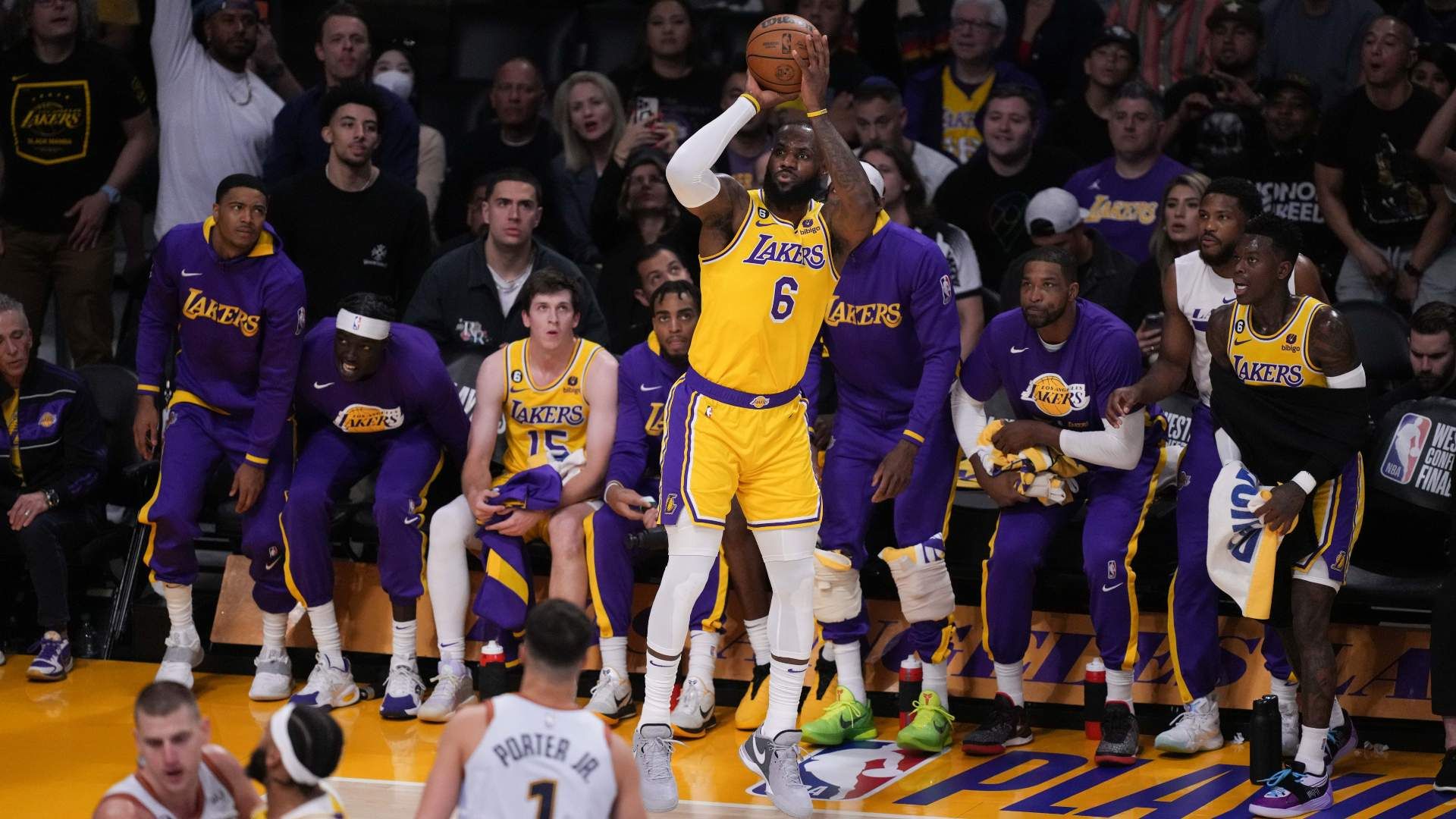 May 22, 2023; Los Angeles, California, USA; Los Angeles Lakers forward LeBron James (6) shoots the ball against the Denver Nuggets during the first quarter in game four of the Western Conference Finals for the 2023 NBA playoffs at Crypto.com Arena. Mandatory Credit: Kirby Lee-USA TODAY Sports