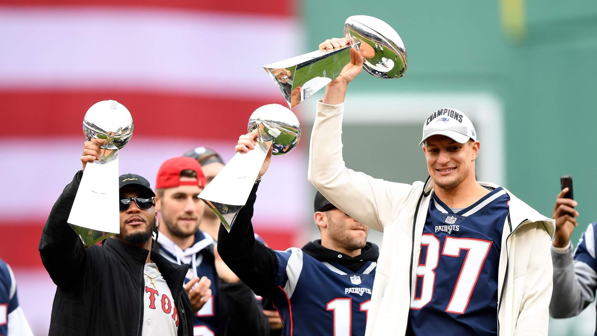 Apr 9, 2019; Boston, MA, USA; Retired New England Patriots player Rob Gronkowski holds up a Lombardi Trophy before a game between the Boston Red Sox and the Toronto Blue Jays at Fenway Park. Mandatory Credit: Brian Fluharty-USA TODAY Sports