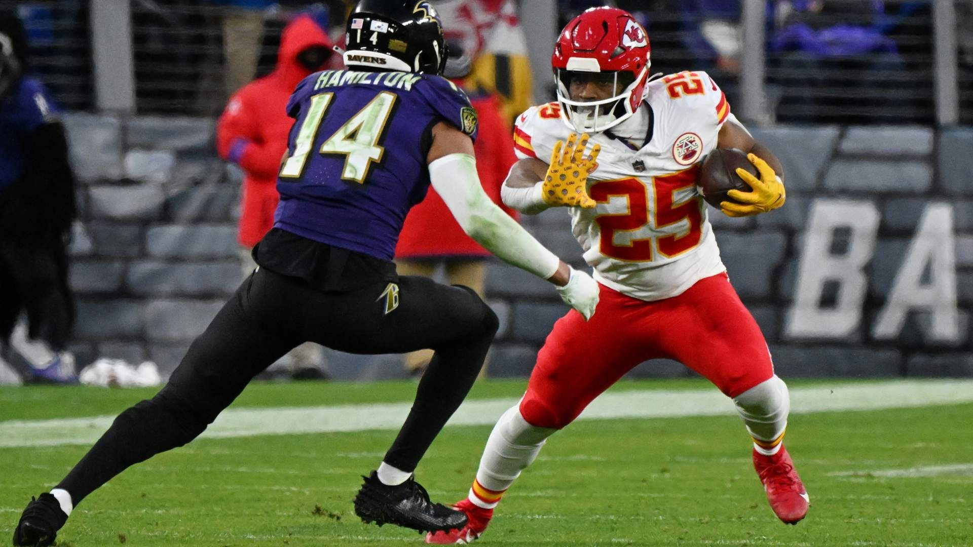 Jan 28, 2024; Baltimore, Maryland, USA; Kansas City Chiefs running back Clyde Edwards-Helaire (25) runs with the ball against Baltimore Ravens safety Kyle Hamilton (14) during the second half in the AFC Championship football game at M&T Bank Stadium. Mandatory Credit: Tommy Gilligan-USA TODAY Sports
