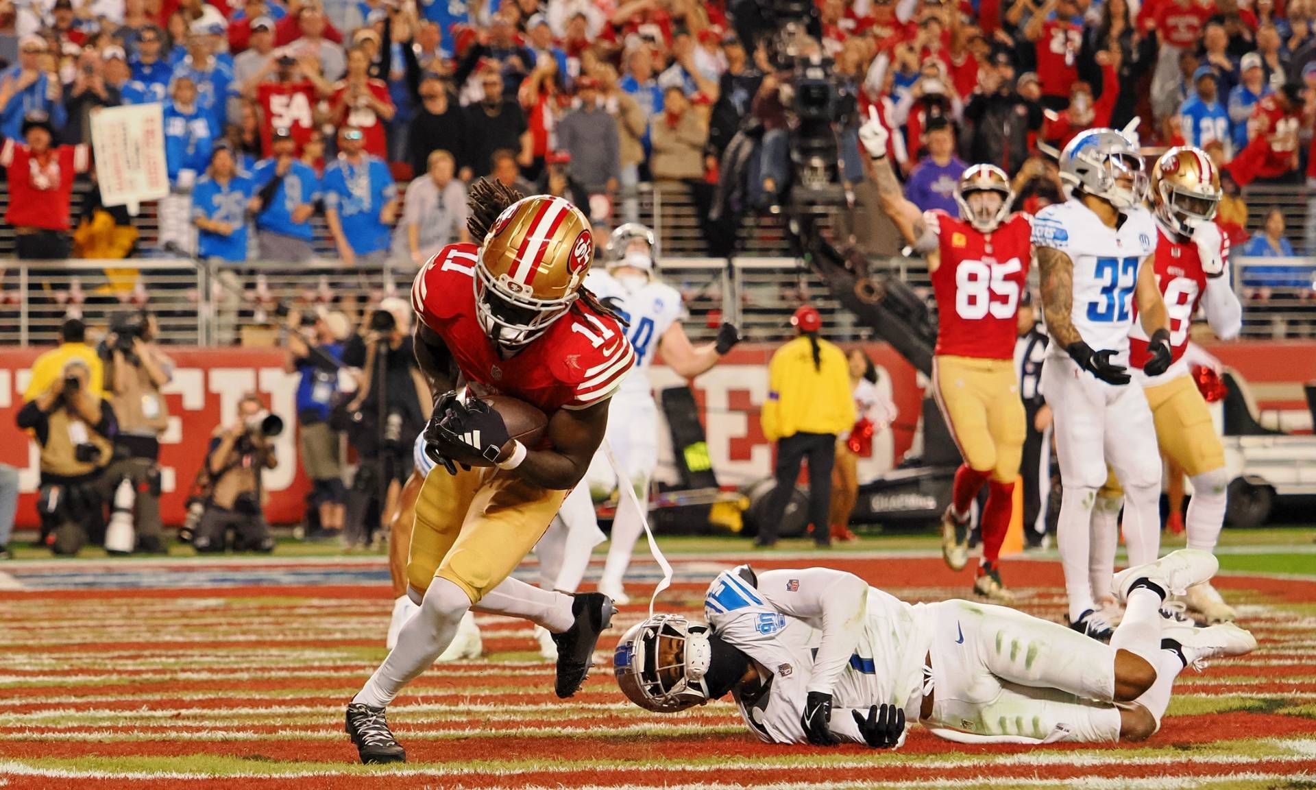 Jan 28, 2024; Santa Clara, California, USA; San Francisco 49ers wide receiver Brandon Aiyuk (11) makes a catch for a touchdown against the Detroit Lions during the second half of the NFC Championship football game at Levi's Stadium. Mandatory Credit: Kelley L Cox-USA TODAY Sports