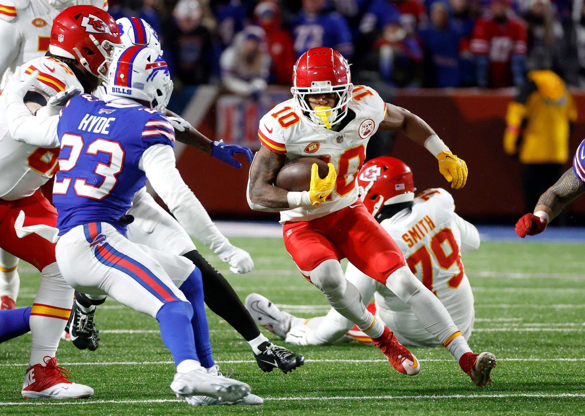 Kansas City Chiefs running back Isiah Pacheco (10) cuts back for a short gain.