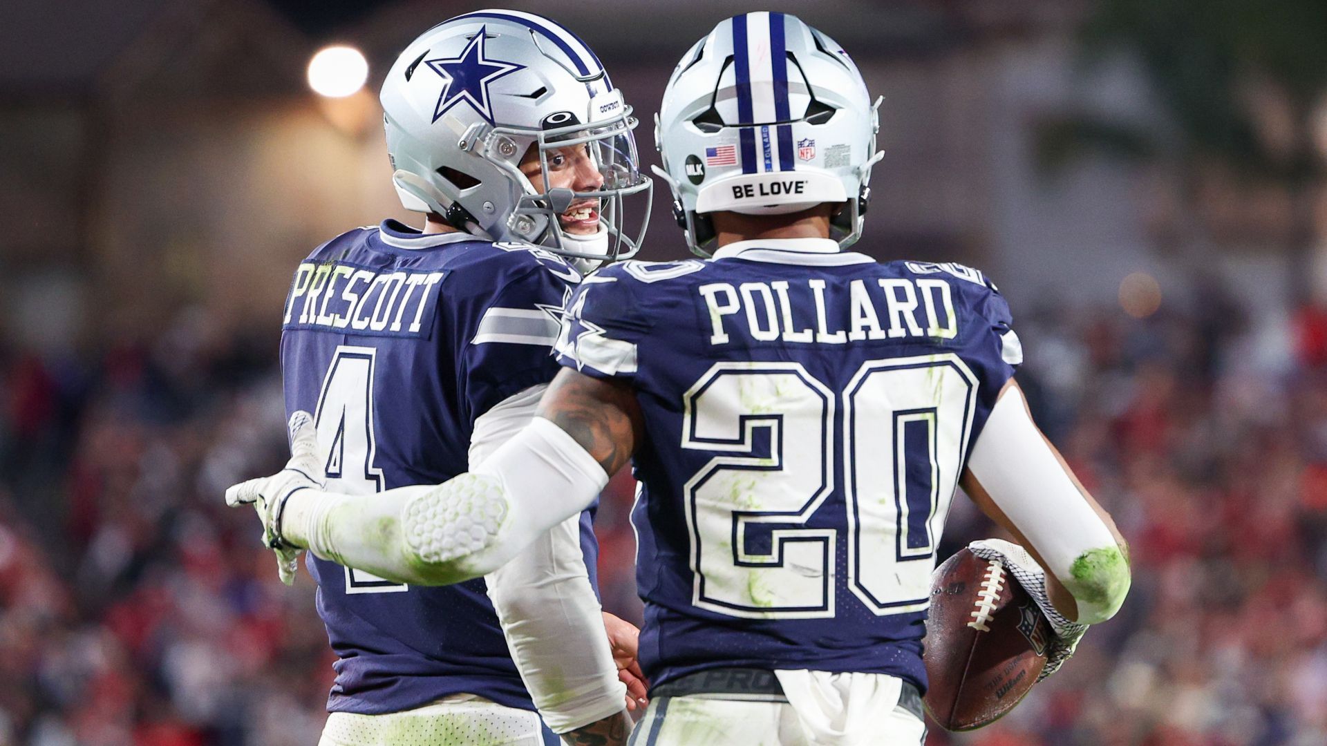 Jan 16, 2023; Tampa, Florida, USA; Dallas Cowboys quarterback Dak Prescott (4) and running back Tony Pollard (20) react after a play against the Tampa Bay Buccaneers in the second quarter during a wild card game at Raymond James Stadium. Mandatory Credit: Nathan Ray Seebeck-USA TODAY Sports