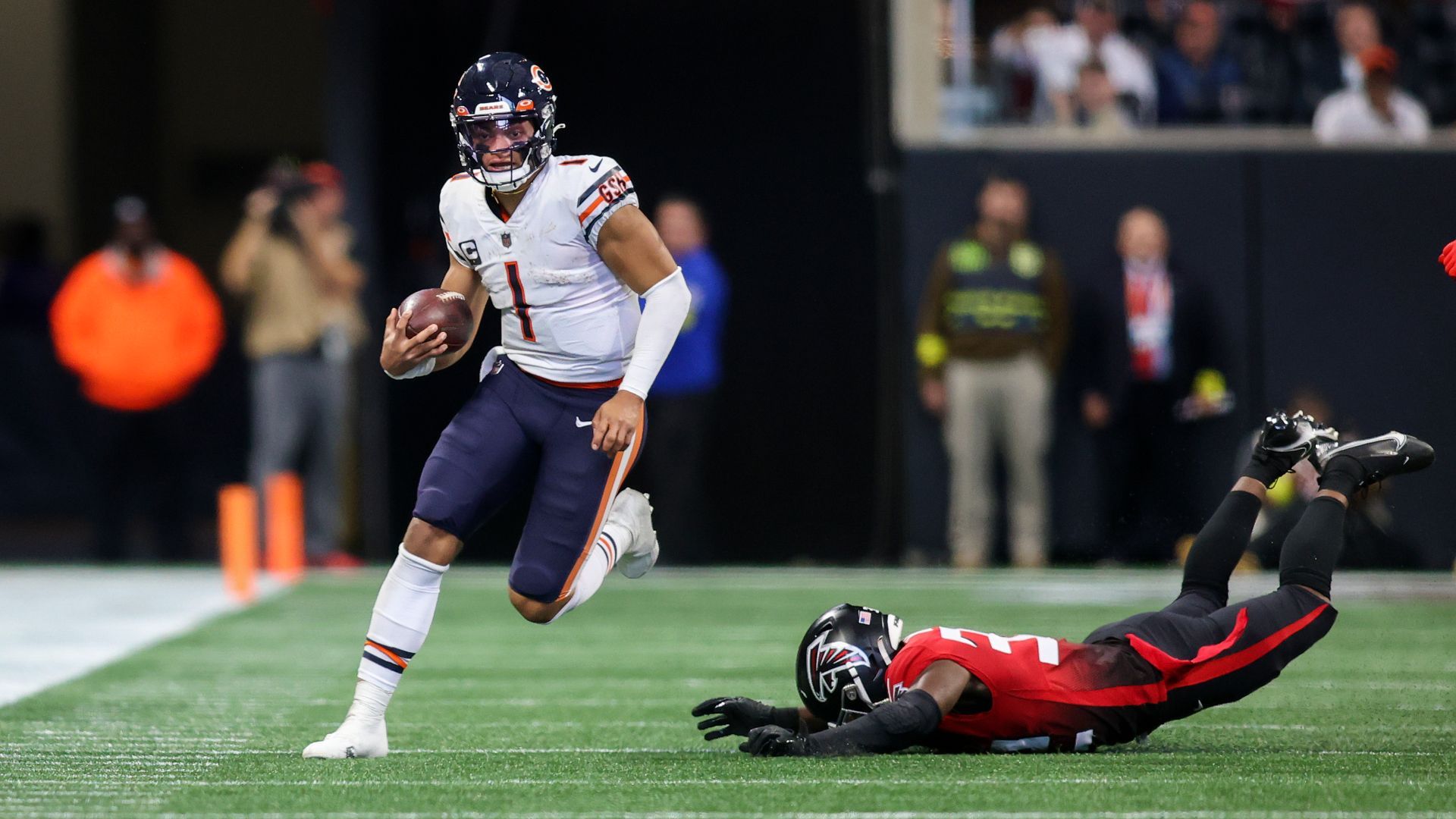 Nov 20, 2022; Atlanta, Georgia, USA; Chicago Bears quarterback Justin Fields (1) runs past Atlanta Falcons cornerback Darren Hall (34) in the second quarter at Mercedes-Benz Stadium. Mandatory Credit: Brett Davis-USA TODAY Sports