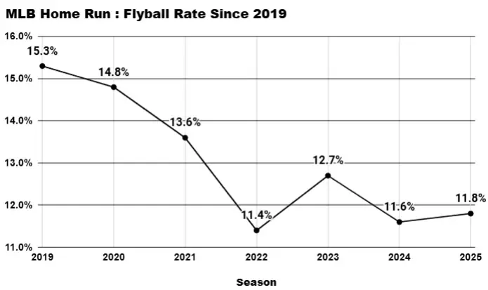 Last week, I hypothesized the uproar concerning torpedo bats would likely prove to be an overreaction to small samples in a very windy Yankee Stadium. Of course, it’s still too early for a concrete determination, but it’s certainly pointing in that direction. Over the last week, MLB’s leaguewide Home Run-to-Flyball rate sank nearly two full ticks. Now nosediving toward recent lows (image below), soon we’ll be hearing how every hitter needs a new bat designed in an underground Area-51 lab somewhere.