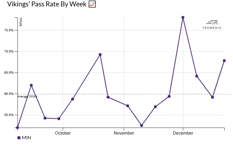I’ve been especially encouraged by the chains coming off the offense. We know MIN wants to sling it with Kevin O’Connell controlling the headset and that’s really manifested in the Vikes’ elevated pass rate as confidence grows within the system (image below).
