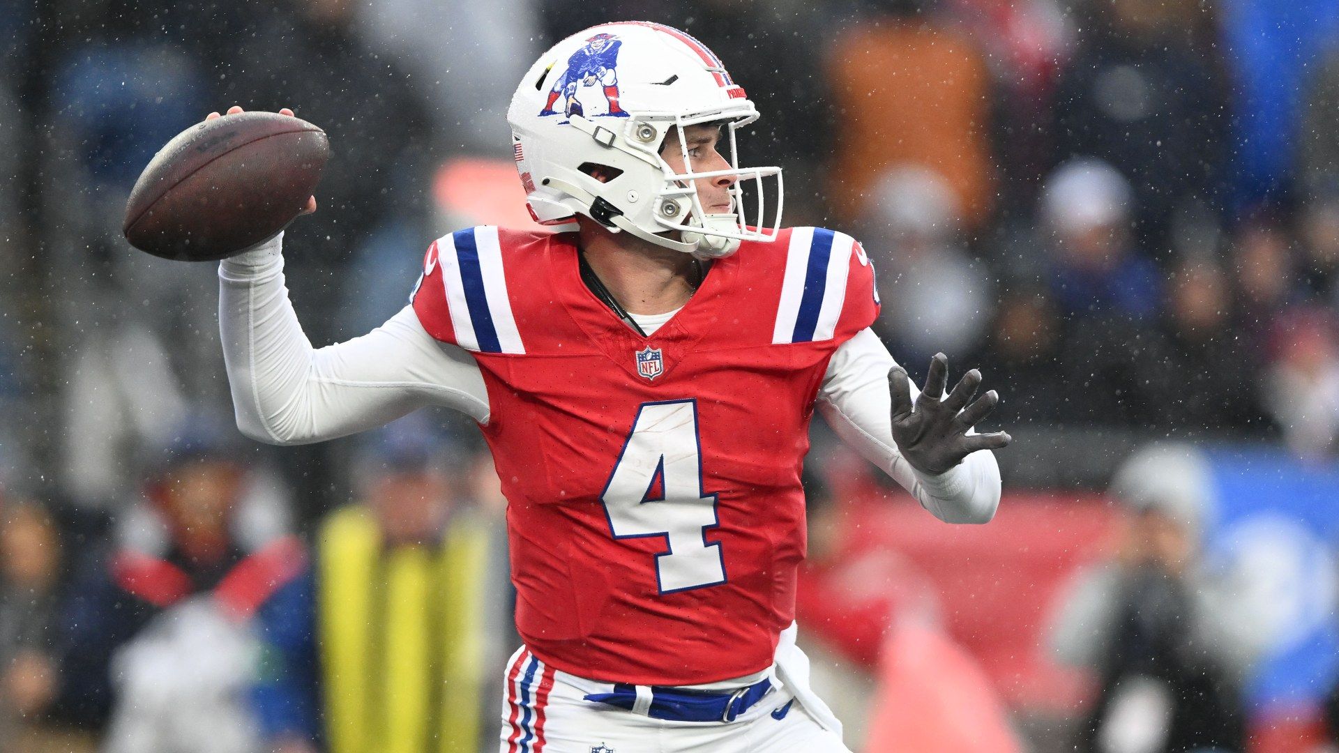 Dec 3, 2023; Foxborough, Massachusetts, USA; New England Patriots quarterback Bailey Zappe (4) throws the ball against the Los Angeles Chargers during the first half at Gillette Stadium. Mandatory Credit: Brian Fluharty-USA TODAY Sports