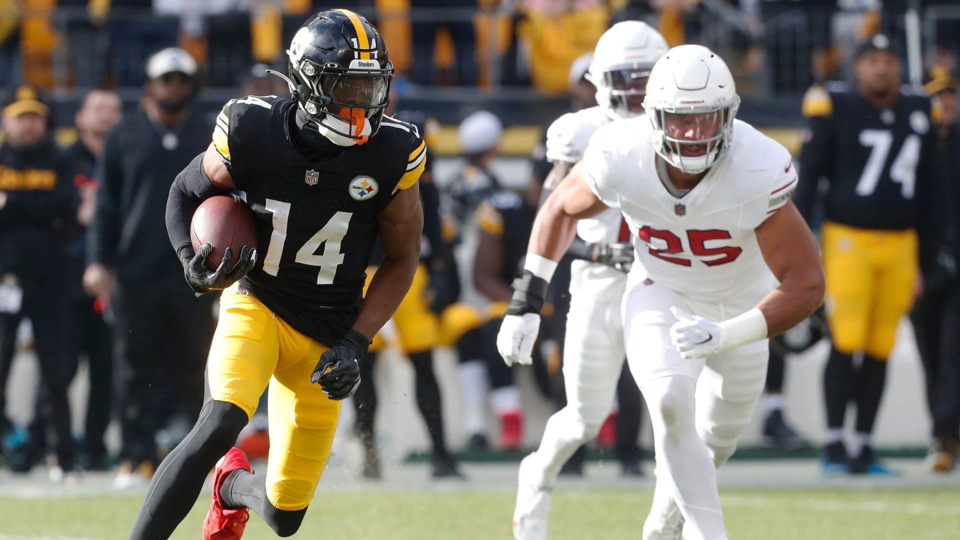 Dec 3, 2023; Pittsburgh, Pennsylvania, USA; Pittsburgh Steelers wide receiver George Pickens (14) runs after a catch as Arizona Cardinals linebacker Zaven Collins (25) chases during the first quarter at Acrisure Stadium. Mandatory Credit: Charles LeClaire-USA TODAY Sports