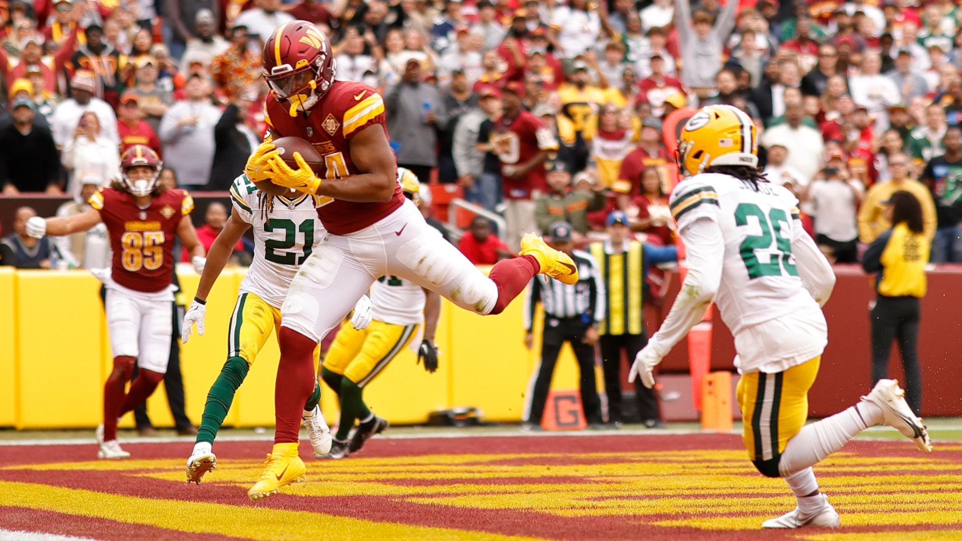 Oct 23, 2022; Landover, Maryland, USA; Washington Commanders running back Antonio Gibson (24) catches a touchdown pass as Green Bay Packers safety Darnell Savage (26) defends during the second quarter at FedExField. Mandatory Credit: Geoff Burke-USA TODAY Sports